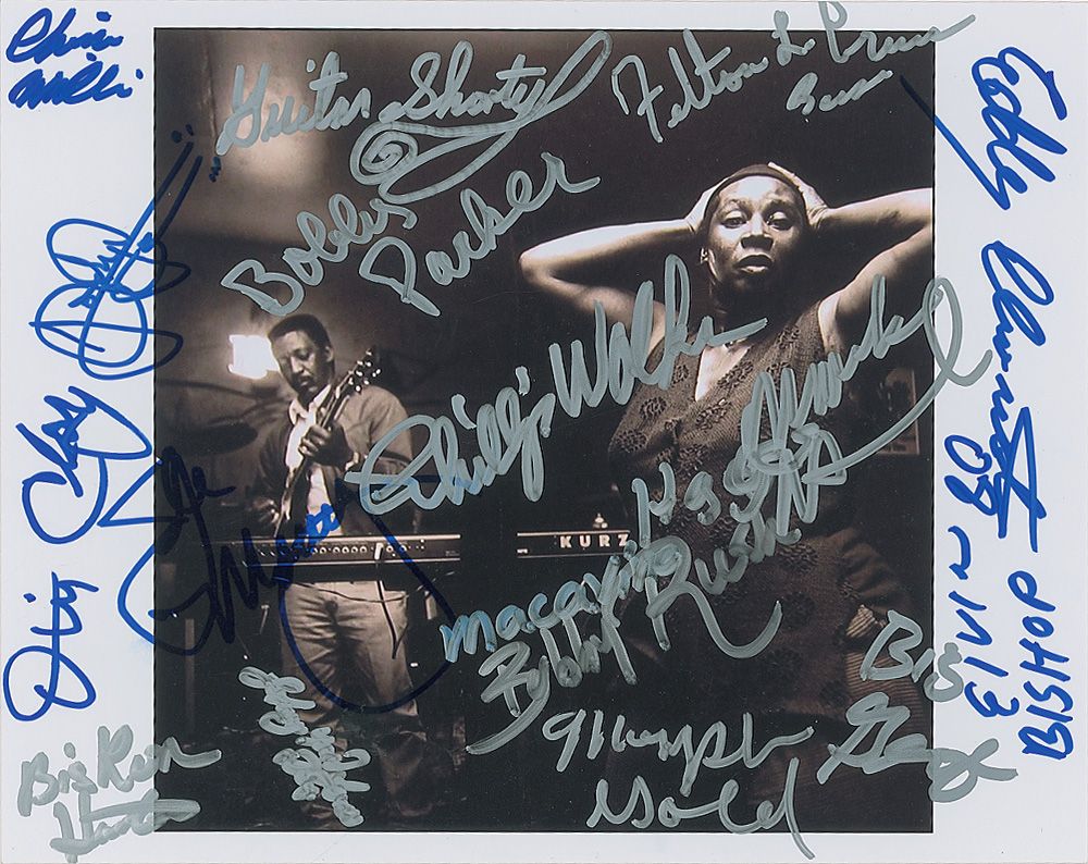 Satin-finish 10 x 8 artistic photo of a blues performance, signed in ink and felt tip by 17 blues greats: Bobby Rush, Phillip Walker, Elvin Bishop, Jody Williams of Howlin Wolf, Guitar Shorty, Eddy 'The Chief' Clearwater, Bobby Parker, Otis Clay, John Mooney, Johnny 'Yard Dog' Jones, Chick Willis, Mark Hummel, Memphis Gold, Macavine Hayes, Big Ron Hunter, Big George Jackson, and Felton L. Cruise. In fine condition.