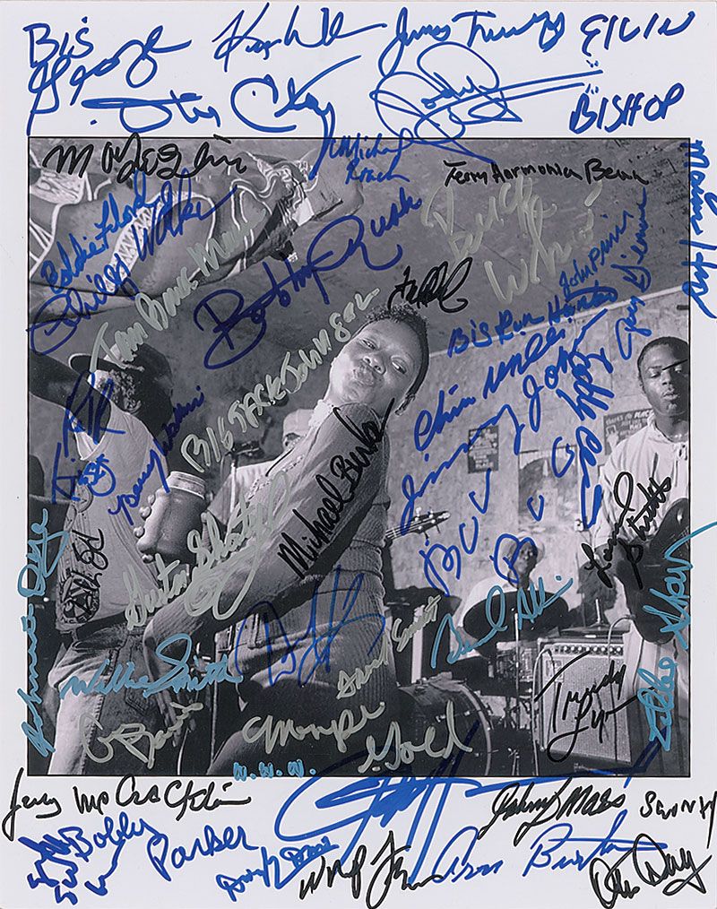 Satin-finish 11 x 14 photo of some blues performers and revelers, signed in felt tip and ink by 50 legendary musicians. Signers are: Bobby Rush, Gil Scott Heron, Jimmy McCracklin, Elvin Bishop, Big Jack Johnson, Guitar Shorty, Eddy 'The Chief' Clearwater, Magic Slim, Phillip Walker, Willie ‘Big Eyes’ Smith, John Hammond, Bobby Parker, Jimmy Johnson, Jody Williams of Howlin’ Wolf, Johnny Dyer, Eddie Shaw, Aron Burton, Walter Wolfman Washington, Eddie 'Knock on Wood' Floyd, Lonnie Shields, Buckwheat Zydeco, Kim Wilson of The Fabulous Thunderbirds, John Primer, Beverly Guitar Watkins, Lil Ed of The Blues Imperials, Boo Boo Davis, Otis Clay, Jimmy Thackery of The Nighthawks, Otis Day of The Knights, Tom Bones Malone of The Blues Brothers, Bernard Allison, Chic Willis, Lafayette ‘Shorty’ Gilbert, Memphis Gold, Terry Harmonica Bean, Michael Burks, Trudy Lynn, Big Ron Hunter, Guy Davis, Joey Gilmore, Michael Roach and Johnny Mars, Big George Jackson, Ralph and Donald Kinsey of The Kinsey Report, Frank Smith of Pittsburgh Gospel Lights, Daryl Davis, Whop Frazier, Macavine Hayes, and Freddie Cunningham of Root Doctor. In fine condition.