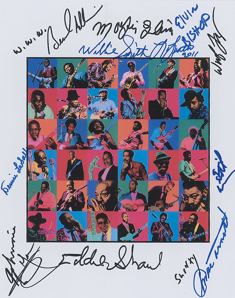 Color satin-finish 11 x 14 photo of a pop art rendering of blues legends, signed in blue and black felt tip by Gil Scott Heron, Lazy Lester, Elvin Bishop, Willie 'Big Eyes' Smith, Magic Slim, Denise La Sallle, Johnnie Dyer, Walter Wolfman Washington, Eddie Shaw, Bernard Allison, Mac Arnold, Shorty Gilbert, and Whop Frazier. In very fine condition.