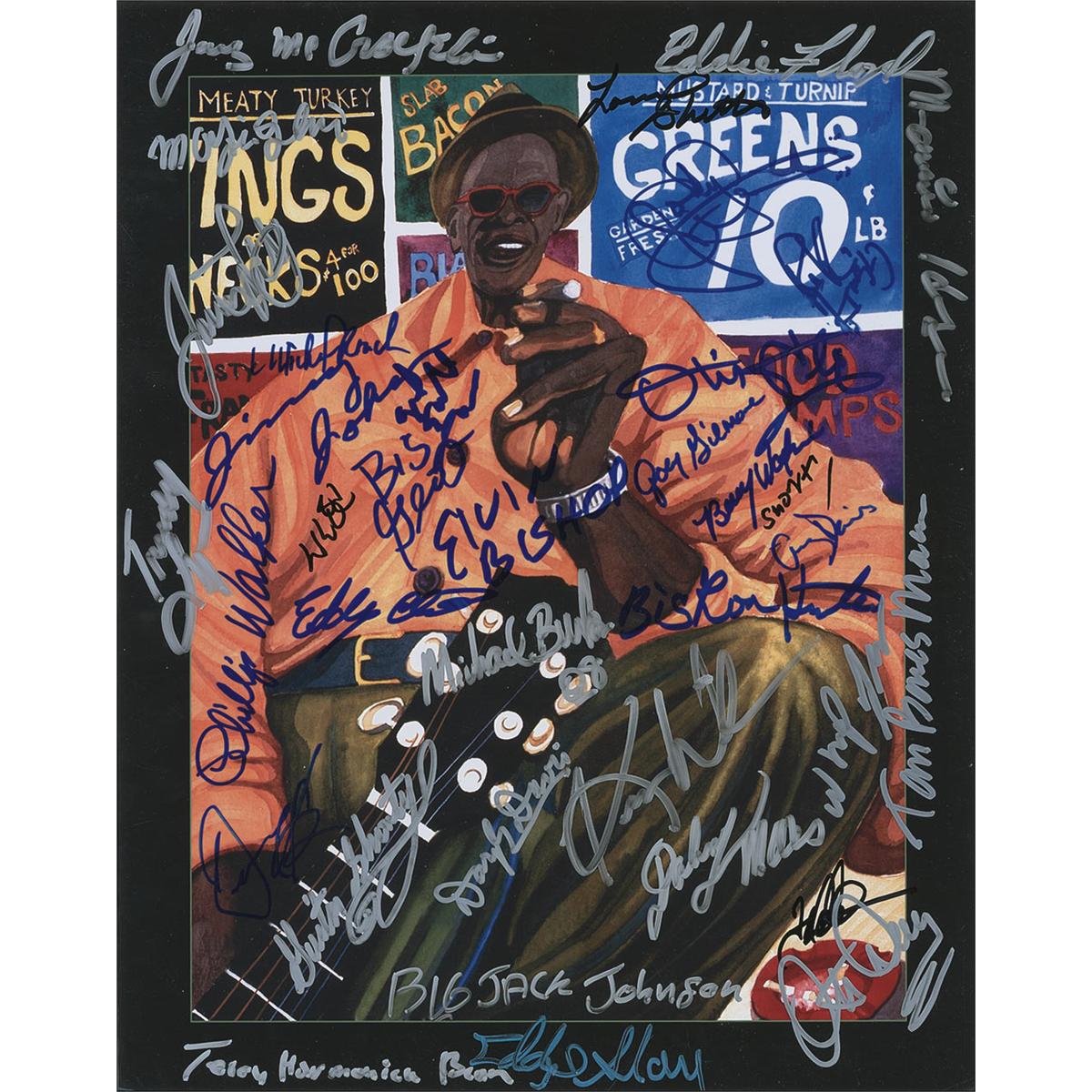 Color glossy 11 x 14 photo of an artist’s work, signed in blue felt tip and silver ink by 36 blues legends: Jimmy McCracklin, Gil Scott-Heron, Guitar Shorty, Elivin Bishop, Big Jack Johnson, Magic Slim, Eddy 'The Chief' Clearwater, Phillip Walker, Eddie 'The Wolf' Shaw, Jody Williams of Howlin Wolf, Jimmy Johnson, Eddie 'Knock on Wood' Floyd, Kim Wilson of Fabulous Thunderbirds, Jimmy Thackery of The Nighthawks, Lil Ed of The Imperials, Otis Clay, Tom Bones Malone of The Blues Brothers, Donald and Ralph Kinsey of The Kinsey Report, Lonnie Shields, Big George Jackson, Trudy Lynn, Michael Roach, Macavine Hayes, Otis Day of The Knights, Michael Burks, Daryl Davis, Whop Fraizer, Johnny Mars, Terry Harmonica Bean, Beverly Guitar Watkins, Guy Davis, Lafayette 'Shorty' Gilbert, Joey Gilmore, Big Ron Hunter, and Freddie Cunnigham of Root Doctor. In very fine condition.