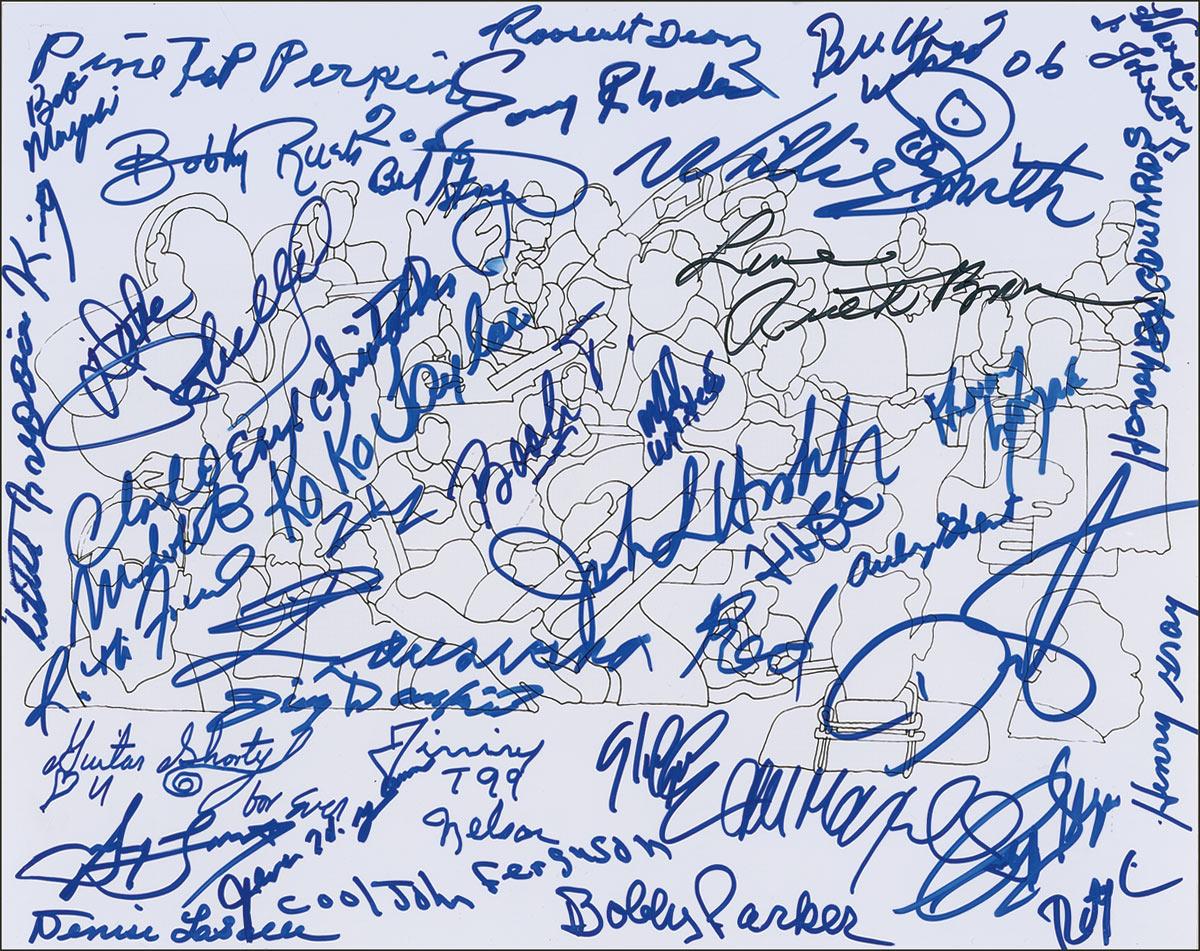 Fantastic glossy 14 x 11 photo of a Tomato Records record cover line drawing, signed mostly in blue felt tip by approximately 40 blues legends. Signers include: David ‘Honeyboy’ Edwards, Ruth Brown, Koko Taylor, Percy Sledge, Henry Gray, Charlie Musselwhite, Bobby Rush, Jimmy Dawkins, Louisiana Red, Sonny Rhodes, John Mayall, Denise LaSalle, Guitar Shorty, Bobby Parker, Buckwheat Zydeco, Willie Smith, Steady Rollin Bob Margolin, Roy C., Bob Stroger, Little Freddie King, Booker T. Jones of Booker T & the MGs, Mel Waiters, Delbert McClinton, Tracy Nelson of Mother Earth, Roosevelt Dean, Jimmie ‘T99’ Nelson, Joe Louis Walker, Lil Ed, Duke Robillard, Big Jesse Yawn, Sonny Landreth, John Lee Hooker, Jr., Cool John Ferguson, Shemekia Copeland, Kenny Blues Boss Wayne, Zac Harmon, Ruthie Foster, Aubrey Ghent, Earl Christopher, and Wanda Johnson. In fine condition with some of the names overlapping.