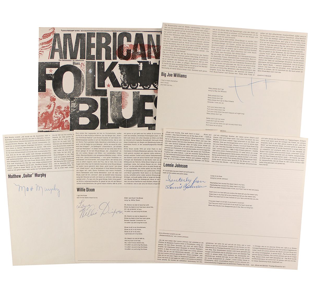 Original program from the 1963 American Folk Blues Festival in Germany, 11 x 10, signed on or near their respective photo or program page by Lonnie Johnson, Willie Dixon, Matt Murphy, and Big Joe Williams, who signs “XXX.” In very good condition, with pages cleanly detached from covers and a few ink notations to unsigned pages. The individual pages are themselves clean and fine.