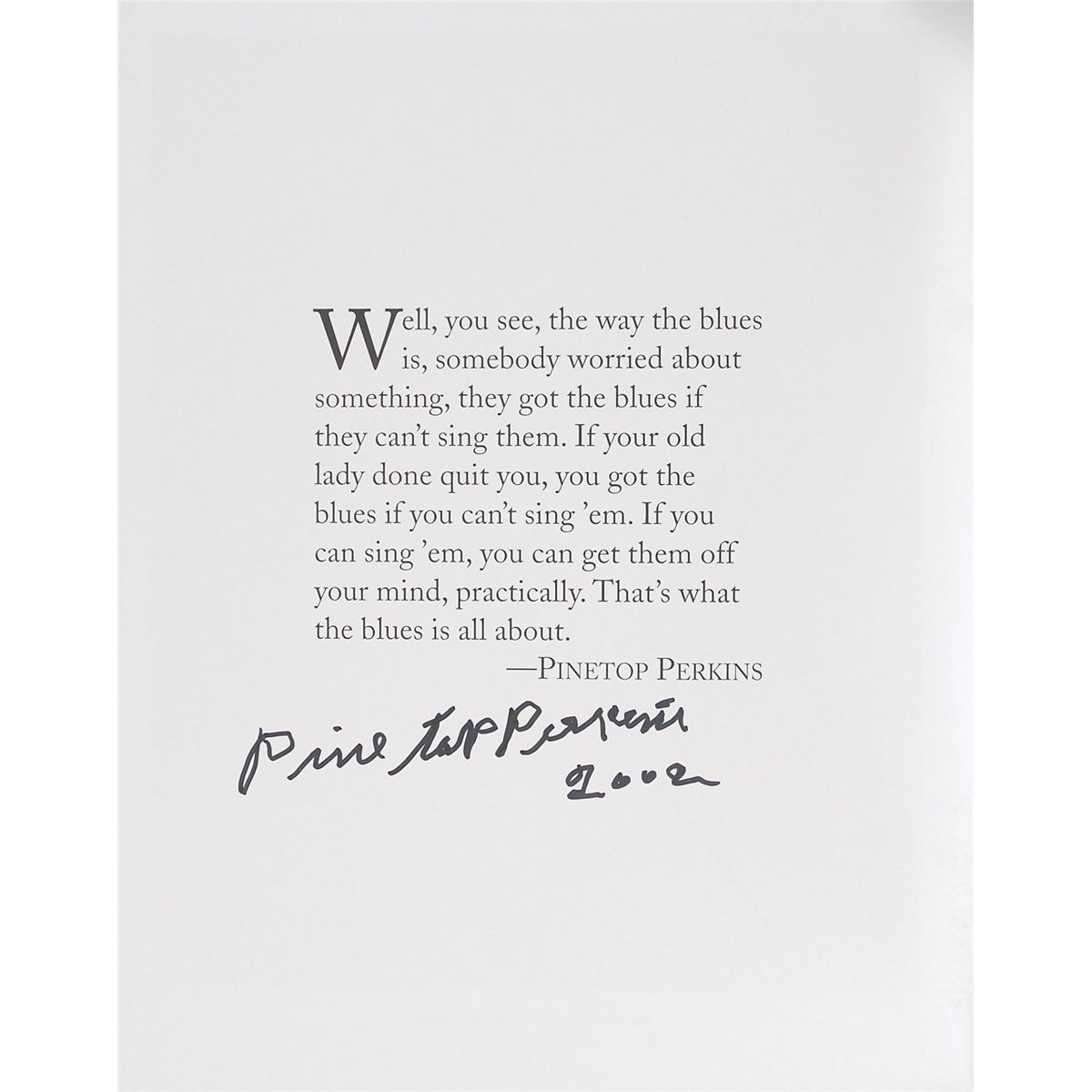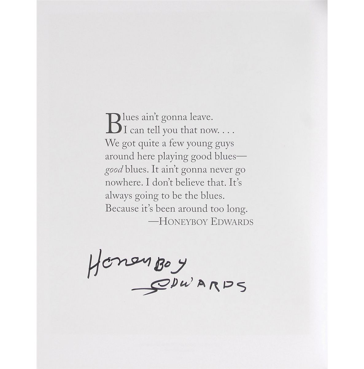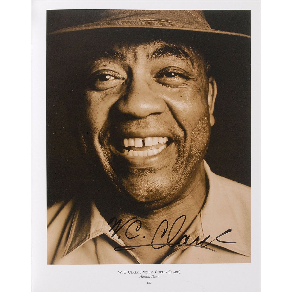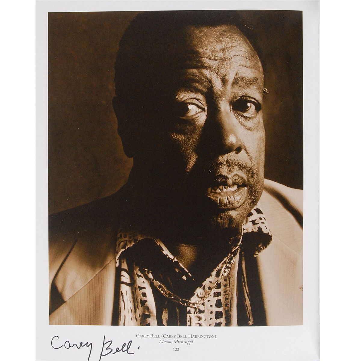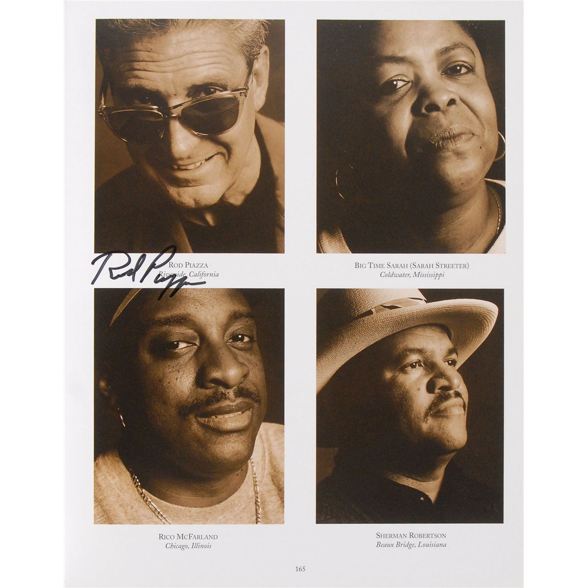 Signed book: State of the Blues. First edition, first printing. NY: Aperture, 1998. Hardcover with dust jacket, 9.75 x 12.25, 174 pages. Signed inside in felt tip near their photographs by Carey Bell, David ‘Honeyboy’ Edwards, Floyd Dixon, Pinetop Perkins, Robert ‘Junior’ Lockwood, Rod Piazza, Snooky Pryor, and W. C. Clark. In fine condition.