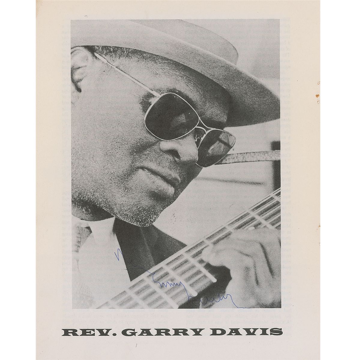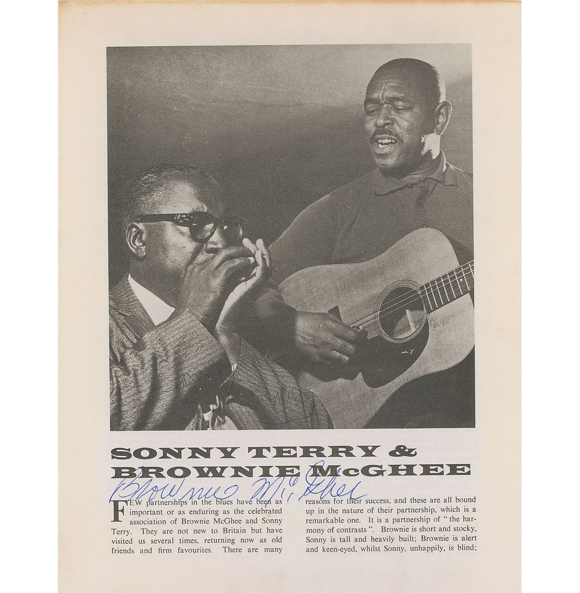 Two book photos, both approximately 8.25 x 10.5, each signed in blue ballpoint by the musicians pictured. Signers are Rev. Gary Davis, and Sonny Terry and Brownie McGhee. In fine condition.