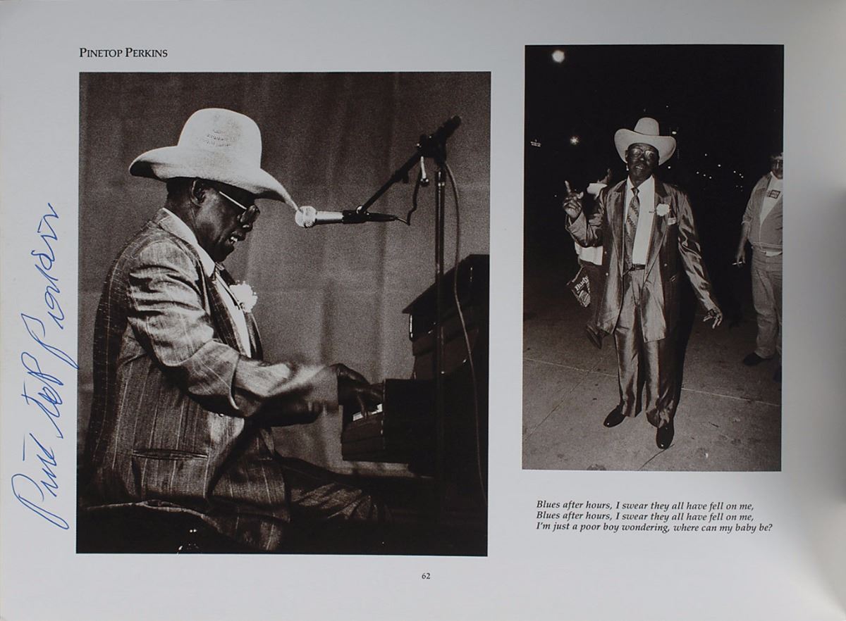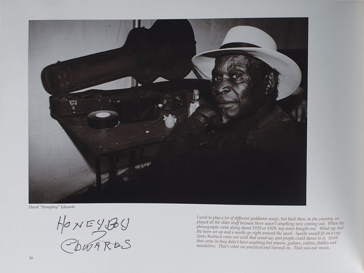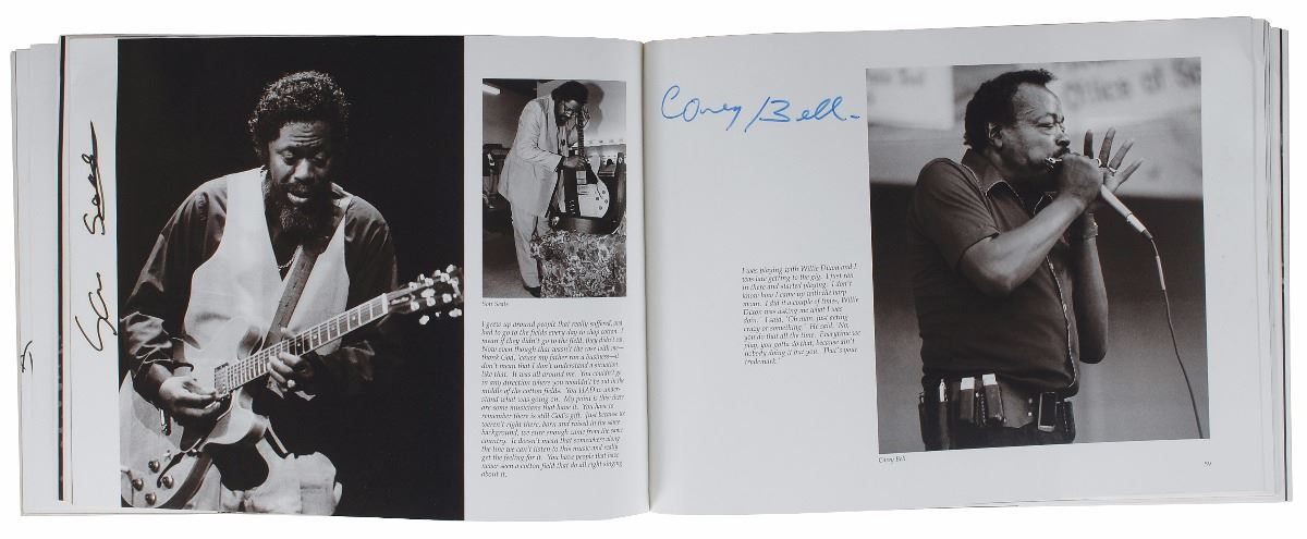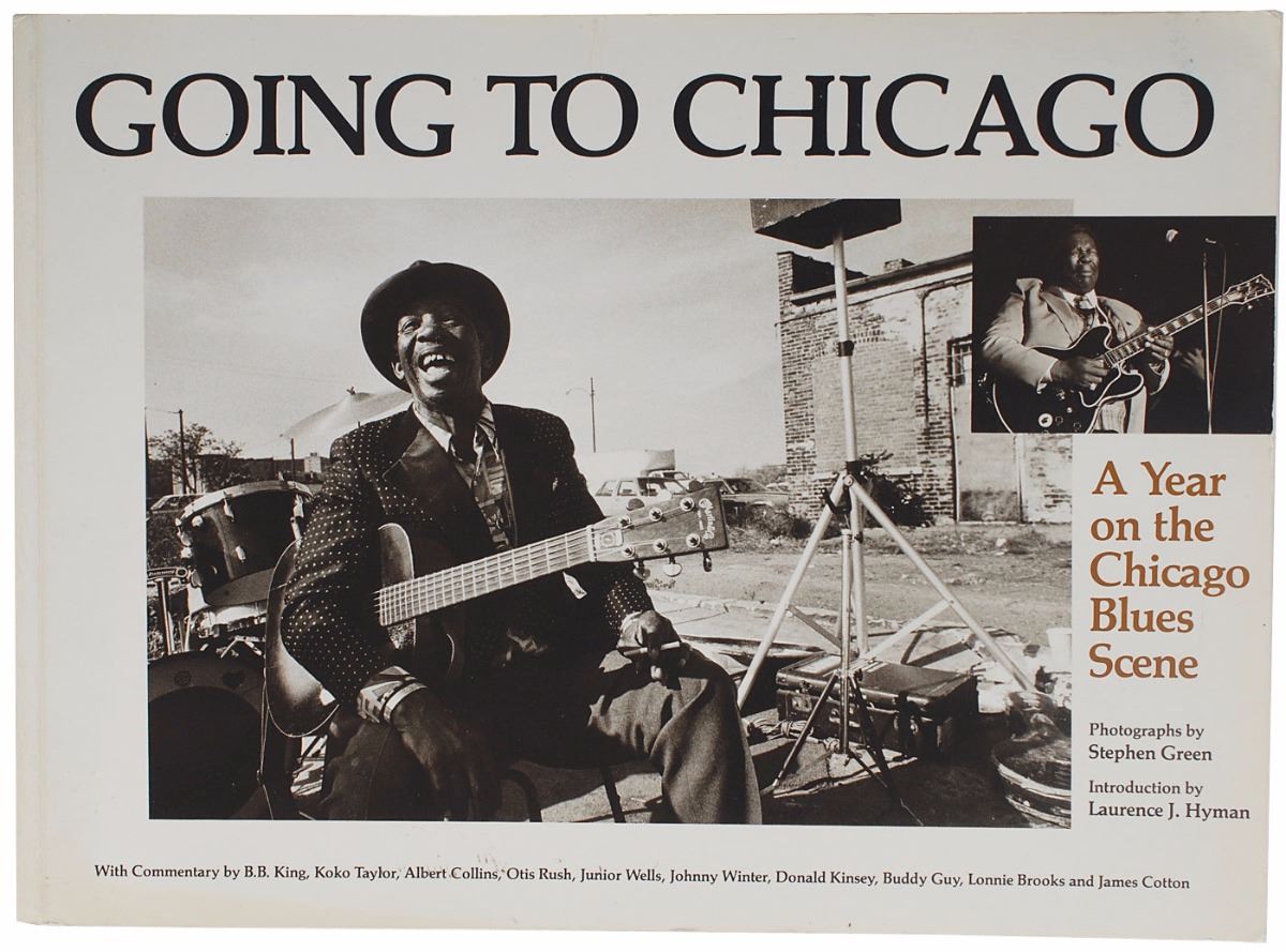 Two softcover blues photo books by Stephen Green, entitled Going to Chicago and Really the Blues, signed throughout by a combined total of forty musicians, including Sunnyland Slim, Pinetop Perkins, Snooky Pryor, Honeyboy Edwards, Son Seals, and Carey Bell. In overall fine condition, with haloing to ink of some signatures.