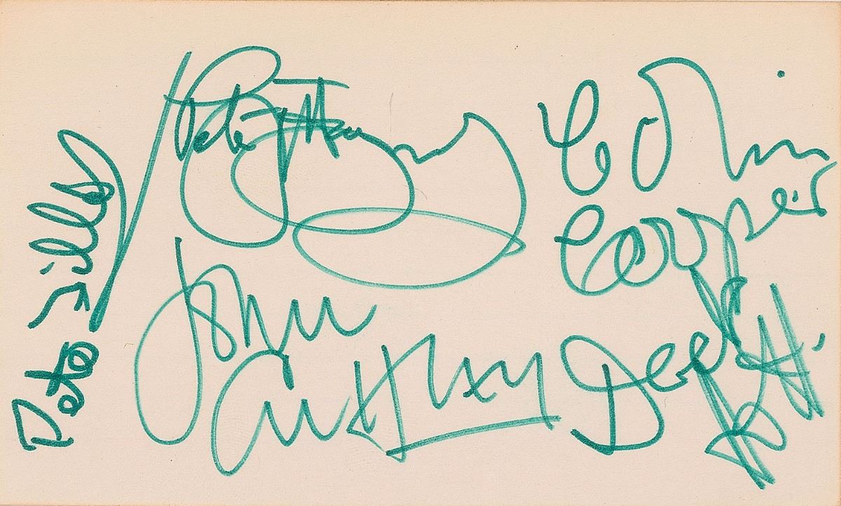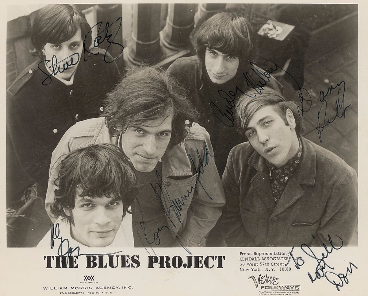Collection of five items signed by blues bands, including: a glossy 10 x 8 Verve Folkways publicity photo of The Blues Project, signed and inscribed in black felt tip, “Danny Kalb,” “Roy Blumenfeld,” “Andy Kulberg,” “Steve Katz,” “Al Kooper,” and “To Jill, love, Don [Kretmar]”; ink signatures of Ten Years After band members, “Chick Churchill,” “Alvin Lee,” “Ric Lee,” and “Leo Lyons” on an off-white 7.5 x 6.5 sheet; ballpoint signatures of the Climax Blues Band circa 1974, “To Clay, Best Wishes, Climax Blues Band, Pete Haycock,” “Colin Cooper,” “John Cuffley,” and “Derek Holt,” on a yellow 3.75 x 4.75 sheet; felt tip signatures of the Climax Blues Band circa 1979, “Pete Haycock,” “Colin Cooper,” “Derek Holt,” “John Cuffley,” and “Pete Filleul”; and ballpoint signatures of Canned Heat, “James Shane,” “Ed Beyer,” “Adolfo Fito de la Parra,” “Boogie On, Richard Hite,” “Bob Hite,” and “Henry Vestine” on an off-white 4 x 5.75 card. In overall fine condition.