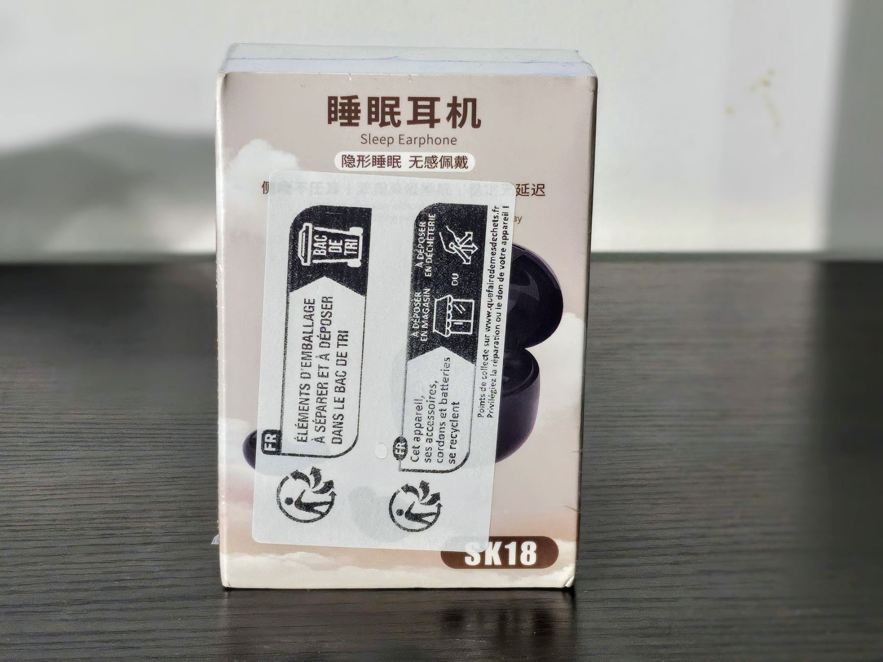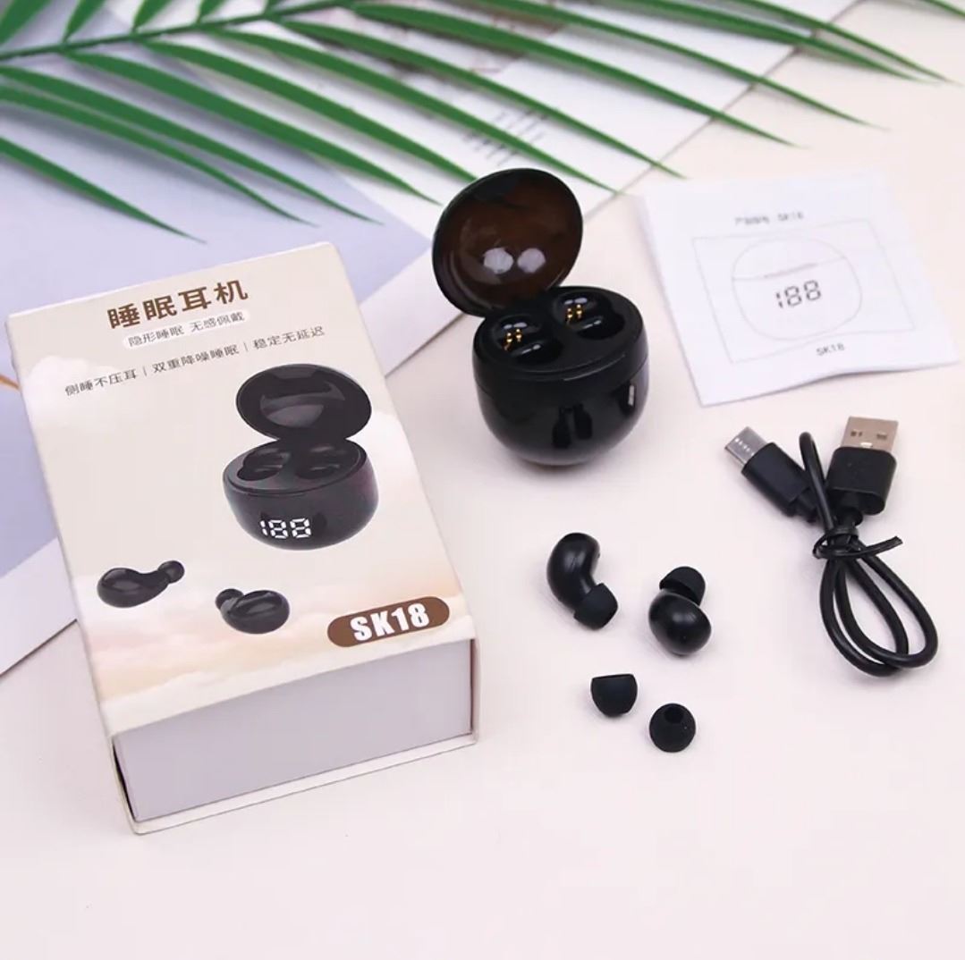 Wireless Bluetooth earbuds, model SK18, Good for sleeping, designed to sit flat in the ear while laying on that side.