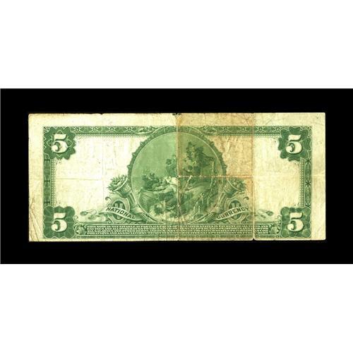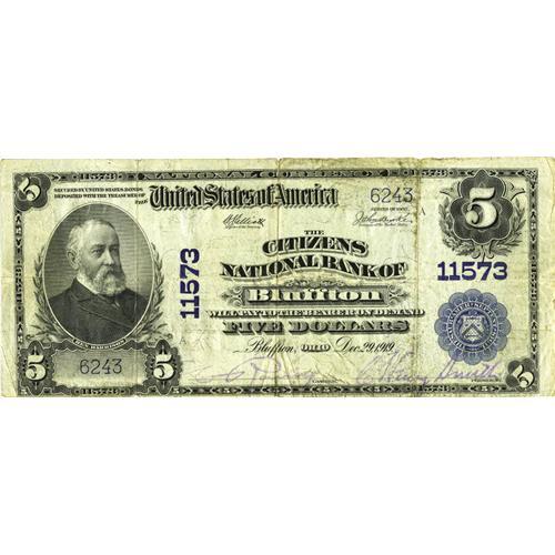<B>Bluffton, OH</B></I> - $5 1902 Plain Back Fr. 607 <B>The Citizens NB</B></I> Ch. # 11573<BR><B>Very Fine,</B></I> but with a band of wallet staining on the back suggesting that it was carried as a keepsake for some time. While two issuers were located here, this was the only one to order the $5 Plain Back design, or any of the Third Charter issues, and it printed only the $5 denomination in both Plain Backs and the 1929 series. Prior to the discovery of this note, just two others of the large size emissions from here had been documented, bringing the verified census to a miniscule total of only $15. In 1935 just $480 of the large size issues from here remained unredeemed, so it is unlikely that many more examples remain to be discovered from this challenging and elusive bank.