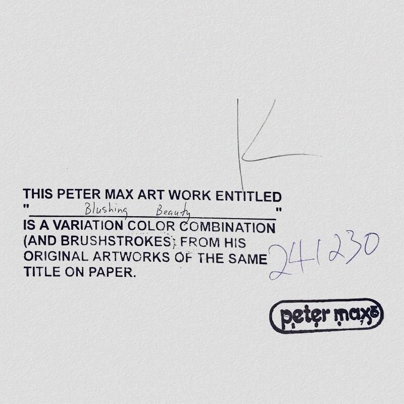 "Blushing Beauty" is a one-of-a-kind mixed media on paper, hand signed by Peter Max. The piece comes custom framed with a backside cutout to display Peter Max Studio registration number 241230 certifying authenticity. Measures approximately 48" x 36" (frame), 36" x 24" (image). This item requires special handling and may have a longer than usual turnaround.