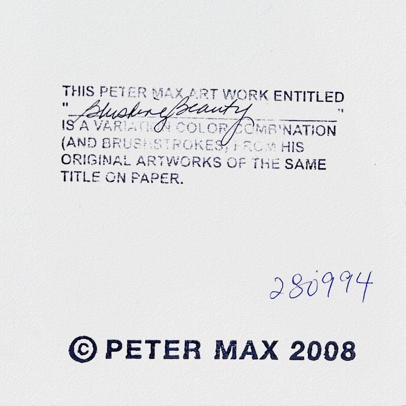 "Blushing Beauty" is a hand signed one-of-a-kind acrylic mixed media on paper by Peter Max. The piece comes custom framed with a backside cutout to display Peter Max Studio registration number 280994 certifying authenticity. Measures approximately 26" x 23" (frame), 13" x 10" (image). This item requires special handling and may have a longer than usual turnaround.