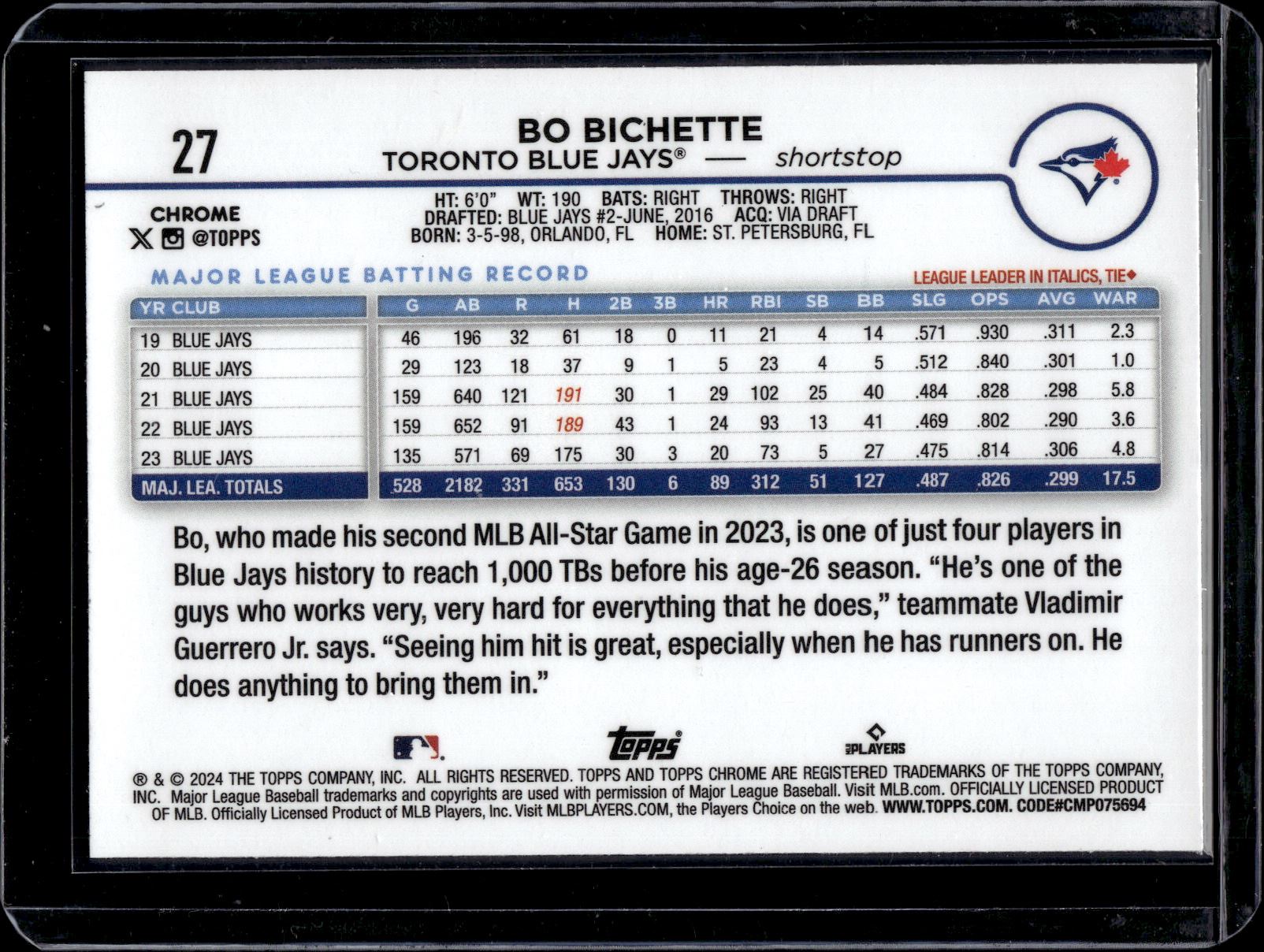 Bo Bichette Raywave Refractor 2024 Topps Chrome #27