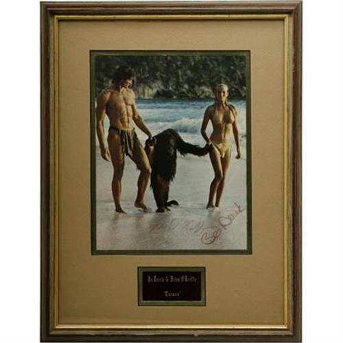 <B>Bo Derek and Miles O'Keeffe Signed "Tarzan" Photo.</B></I> A color 8" x 10" still from the 1981 film <I>Tarzan, the Ape Man</B></I> featuring Miles O'Keeffe, Bo Derek, and an unnamed orangutan, signed by O'Keeffe and Derek in red felt tip. In Excellent condition, matted and framed to an overall size of 13.5" x 17.5".<BR><BR><b>Shipping:</b> Framed - with Glass, Small (<a target="_blank" href="http://www.heritageauctions.com/common/shipping.php">view shipping information</a>)