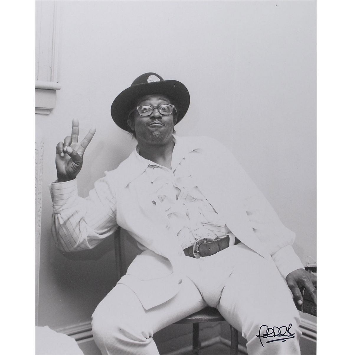 Oversized satin-finish 16 x 20 photo of Diddley, dressed in white, flashing a peace sign, signed in black felt tip by photographer John Rowlands. In fine condition.