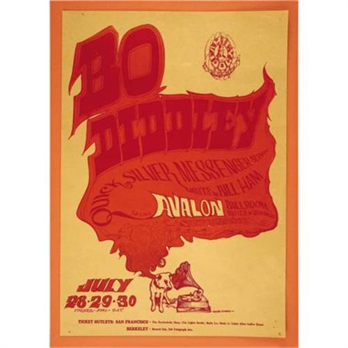 <B>Bo Diddley/Quicksilver Messenger Service Avalon Ballroom Concert Poster, FD-18 (Family Dog, 1966).</B></I> A first-printing example (on brown paper) of an early Family Dog poster, with a Kelley/Mouse design incorporating the famous RCA "Master's Voice" dog and Victrola. The poster measures approximately 14" x 20", and is in VG+ condition, with numerous tack holes.<BR><BR><b>Shipping:</b> Flat Material, Large (<a target="_blank" href="http://www.heritageauctions.com/common/shipping.php">view shipping information</a>)