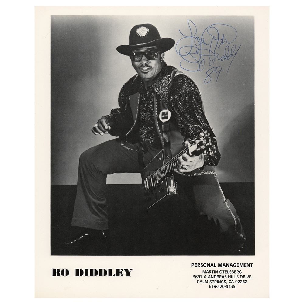 Classic 8 x 10 cardstock photo of Diddley with his trademark rectangular guitar, signed in blue ballpoint, "Love from Bo Diddley, 89." In fine condition, with one surface crease and a light vertical bend.