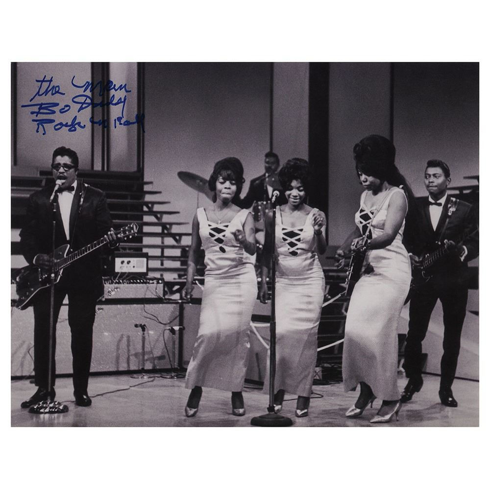 Glossy 14 x 11 photo of a younger Bo Diddley performing with his band, signed in blue felt tip, "The man, Bo Diddley, Rock n roll." In fine condition.