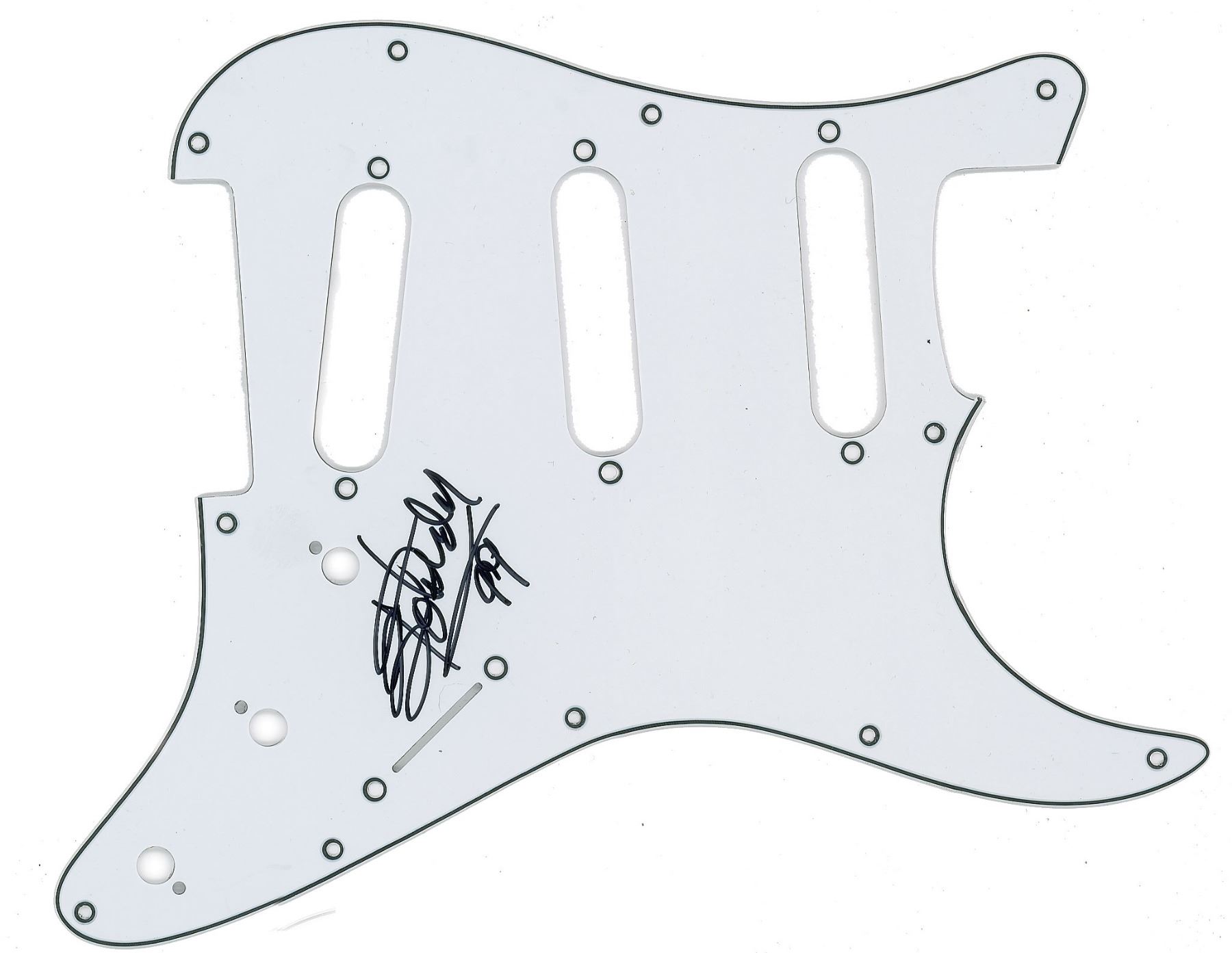 White Stratocaster-style pickguard signed in black felt tip, "Bo Diddley, 99." In fine condition. Accompanied by two tickets for a Bo Diddley performance at the 3rd Street Live Fall Festival in Cedar Rapids on October 22, 1999.