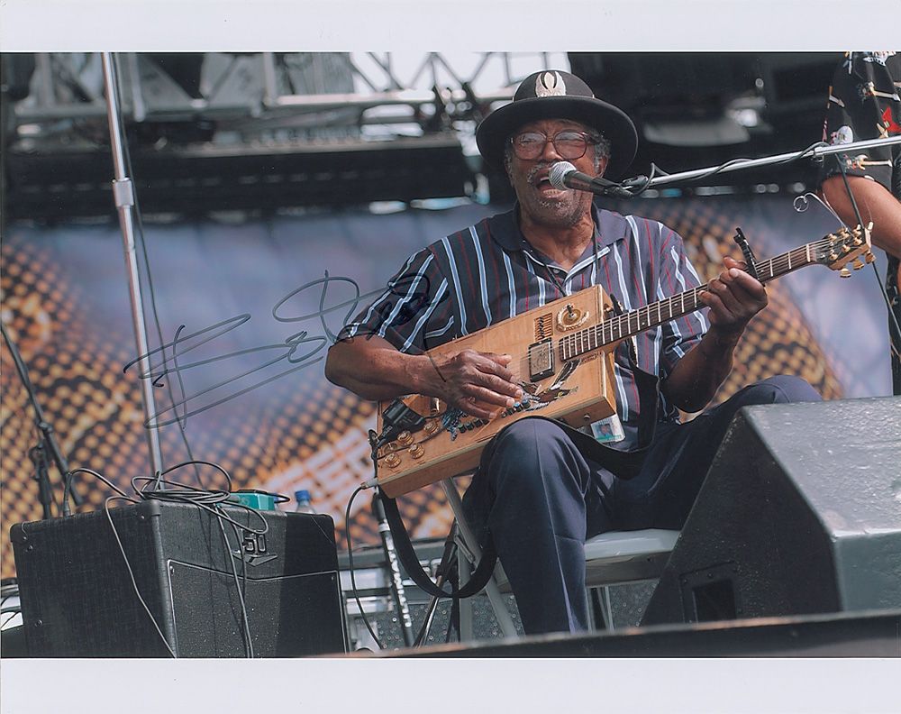 Color glossy 14 x 11 photo of Diddley performing on stage, signed in blue felt tip. In fine condition, with a couple light corner tip creases.