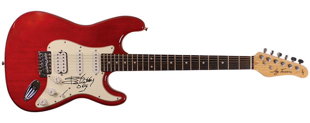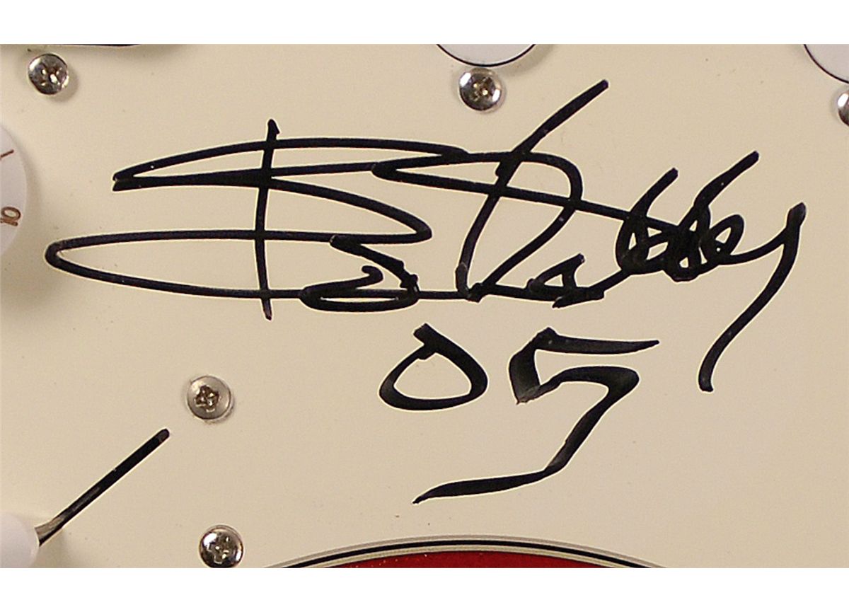 Red-bodied Jay Turser ‘stratocaster-style’ electric guitar signed on the off-white pickguard in black felt tip, “Bo Diddley 05.” In fine condition. Oversized.