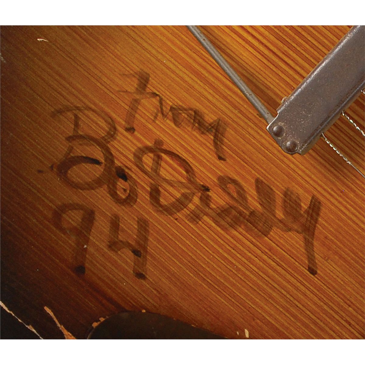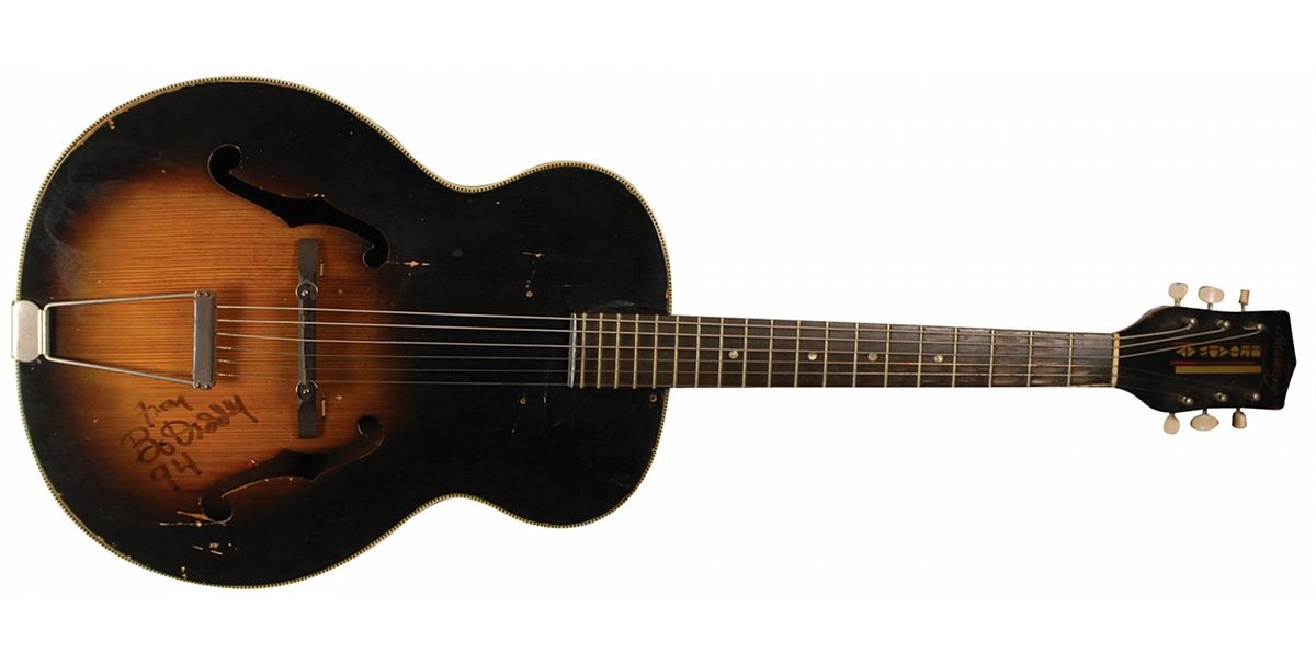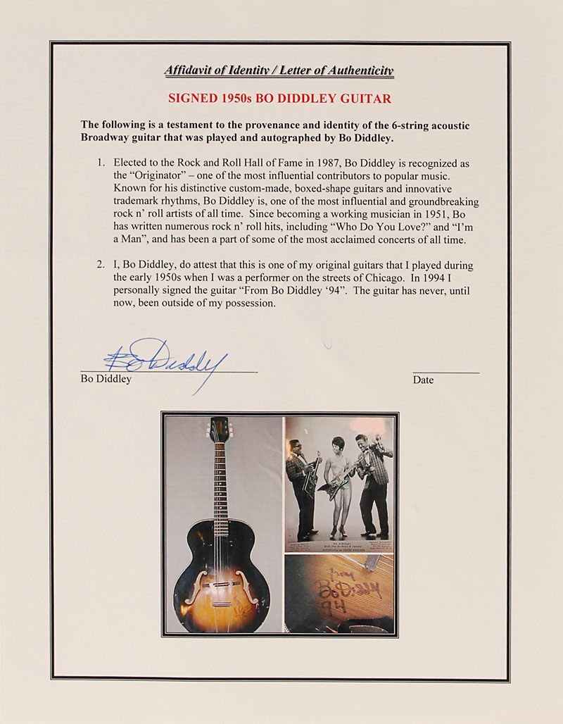 Wood grain Harmony Broadway six-string acoustic guitar, personally owned and played by Diddley in the early 1950s, signed on the body in black felt tip, “From Bo Diddley, ‘94’.” In fair condition, with the expected wear, tear, and repairs associated with a heavily played instrument. Accompanied by a Certificate of Authenticity from Bo Diddley attesting to the ownership of this guitar, stating “one of my original guitars that I played during the early 1950’s when I was a performer on the streets of Chicago…the guitar has never, until now, been out of my possession.”
