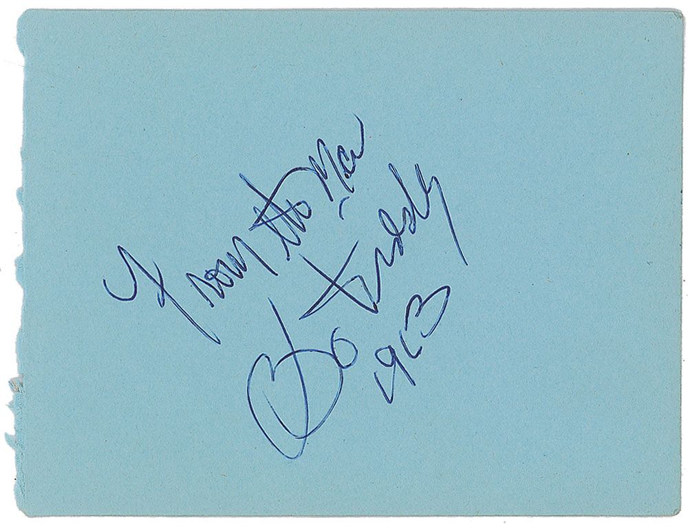 Vintage ballpoint signature, “From the man, Bo Diddley, 1963,” on a blue 4.5 x 3.5 album page. In fine condition. Accompanied by a certificate of authenticity from Tracks.