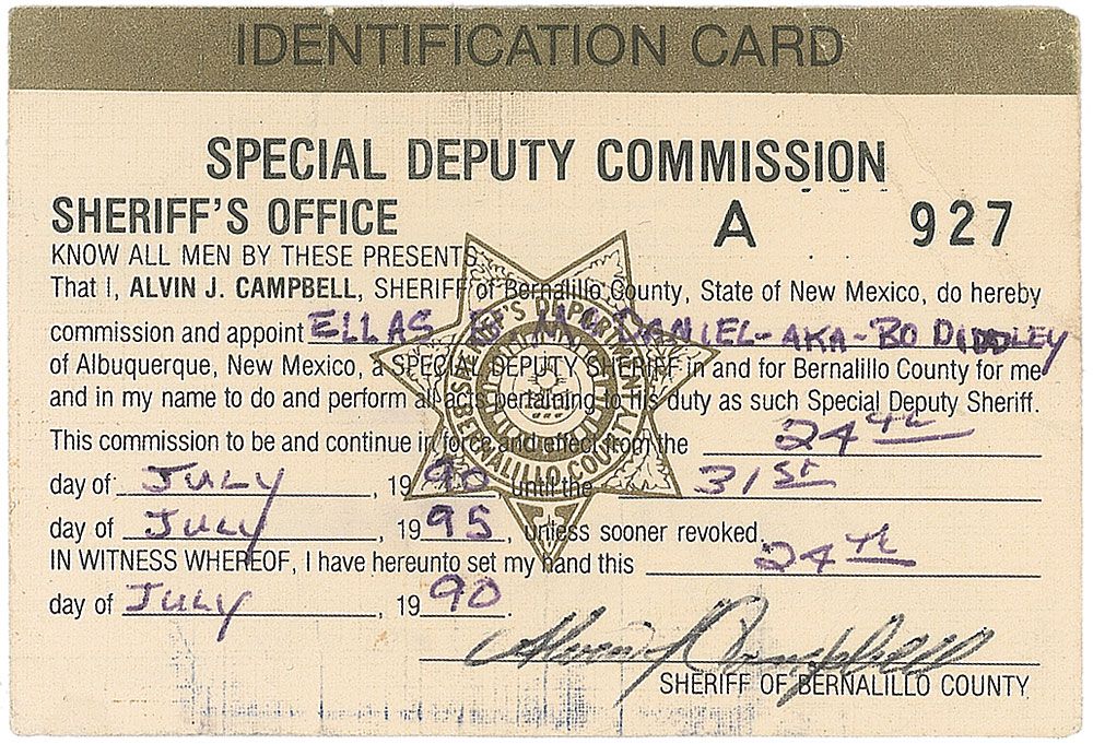 Diddley’s personally-owned black leather wallet, 3.5 x 4.75, featuring his custom special deputy sheriff’s badge from the county for Bernalillo County, New Mexico, engraved with the text, “D.N.A., Bo Diddley, Rock & Roll, #1,” with an enameled design in the center resembling the liberty bell, surrounded by the words, “Liberty & Justice For All.” The left side of the wallet contains a Special Deputy Commission identification card, 3.5 x 2.5, appointing him to the position for the period of July 24, 1990, to July 31, 1995. The card is signed on the reverse by Diddley with his true name and pseudonym, “Ellas McDaniel AKA Bo Diddley.” Overall creases to the identification card, otherwise fine condition. Diddley frequently accessorized his wardrobe with badges, and had an affinity for the Old West, most apparent in the title of his 1960 album, Bo Diddley Is a Gunslinger. During the 1970s, he had also served as a deputy sheriff in the Valencia County, New Mexico, Citizens' Patrol, during which time he purchased and donated three highway patrol pursuit cars. A one-of-a-kind personal item from the great bluesman, highlighted by the unusual variation of his signature.