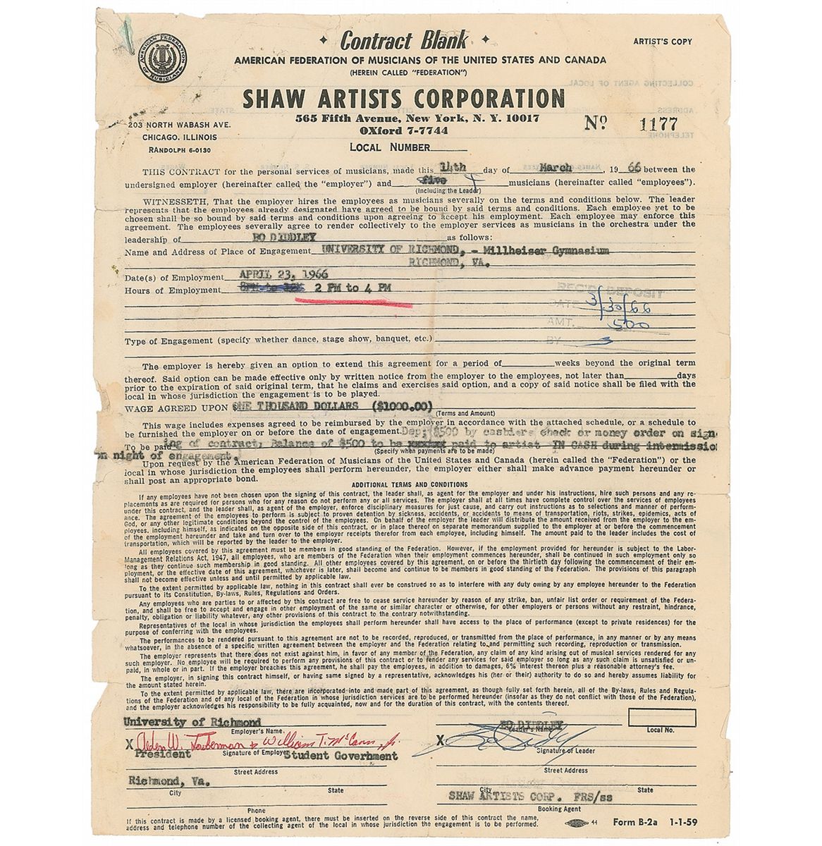 DS one page, 8.25 x 11, March 14, 1966. Agreement for Diddley to play a two-hour show in the Millhiser Gymnasium at the University of Richmond on April 23, 1966, for a fee of $1000.00. Signed at the conclusion by Diddley and also signed by two members of the student government. In good condition, with intersecting folds, creases, paper loss to top edge, some edge tears, extra staple holes, and expected stamps.