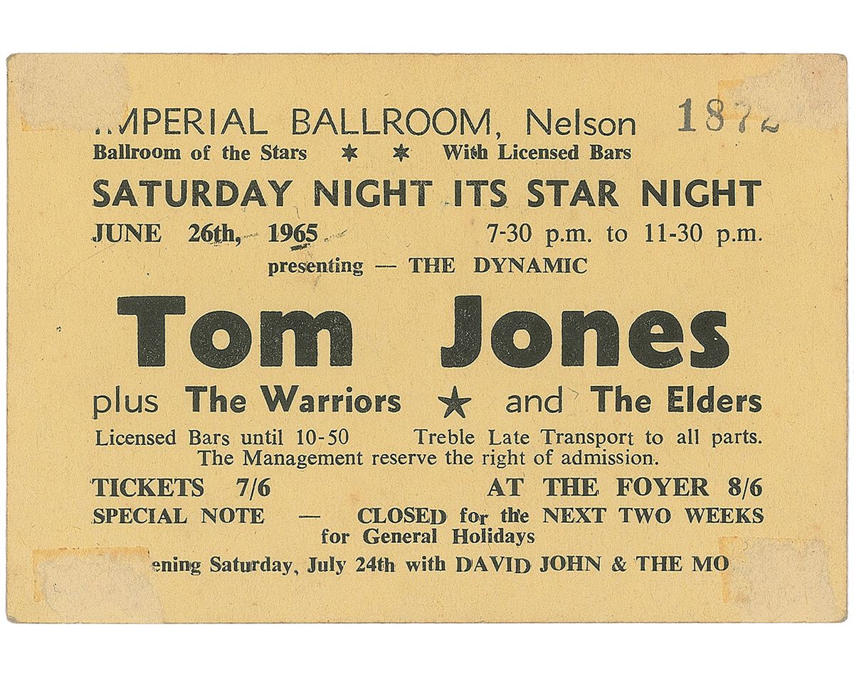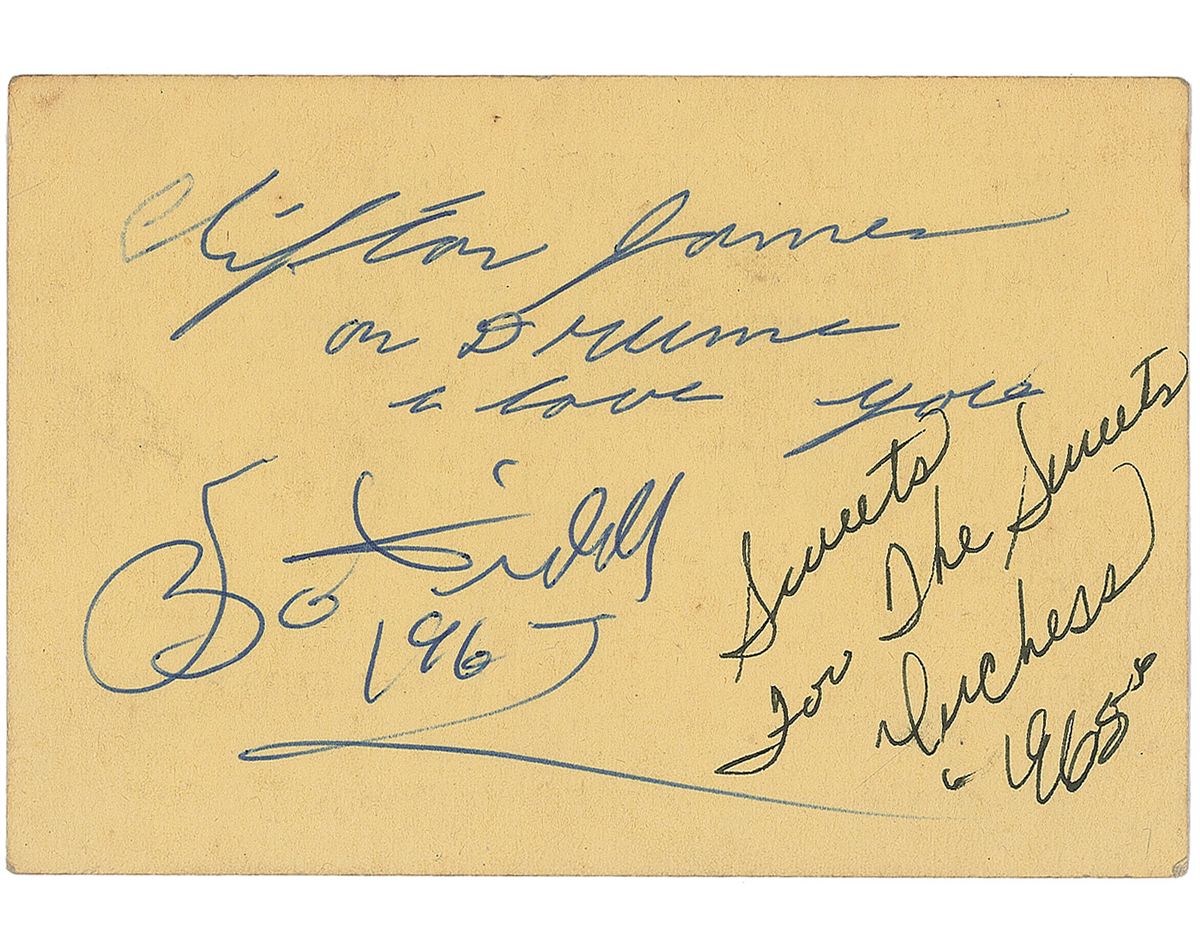 Ballpoint signature, “Bo Diddley, 1965,” on the reverse of a yellow 4.5 x 3 ticket to a Tom Jones concert at the Imperial Ballroom on June 26, 1965. Also signed by Clifton James and Norma-Jean ‘The Duchess’ Wofford. Slight creases and soiling, and small areas of surface loss to front corners from previous mounting, otherwise fine condition. Accompanied by a certificate of authenticity from Tracks.