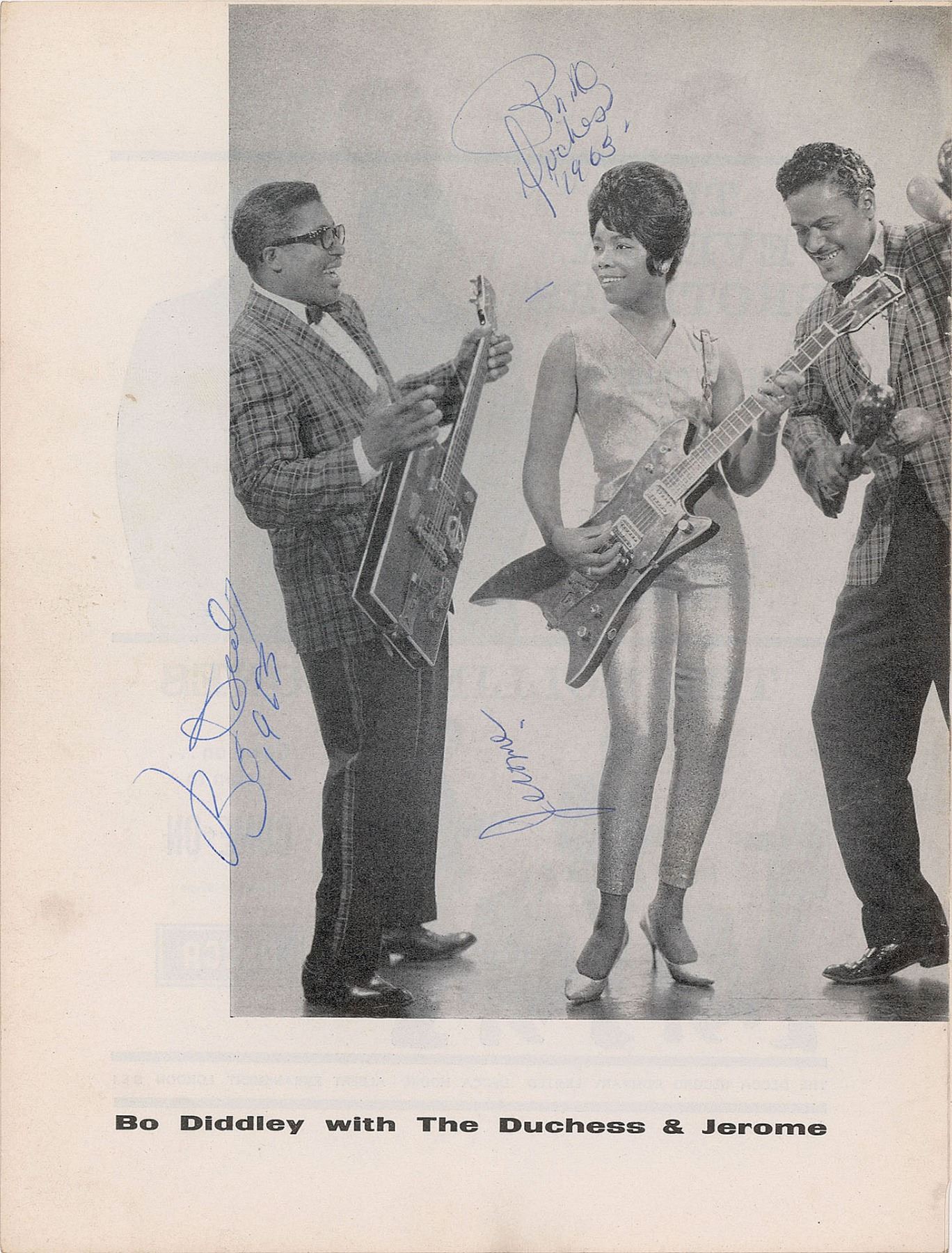 Vintage 8 x 10.5 paperstock photo removed from a 1963 UK concert program, showing Bo Diddley posing with the Duchess and Jerome, signed by all three in blue ballpoint, with Diddley and the Duchess adding "1963." In fine condition, with trimmed edges. Accompanied by a certificate of authenticity from Tracks.