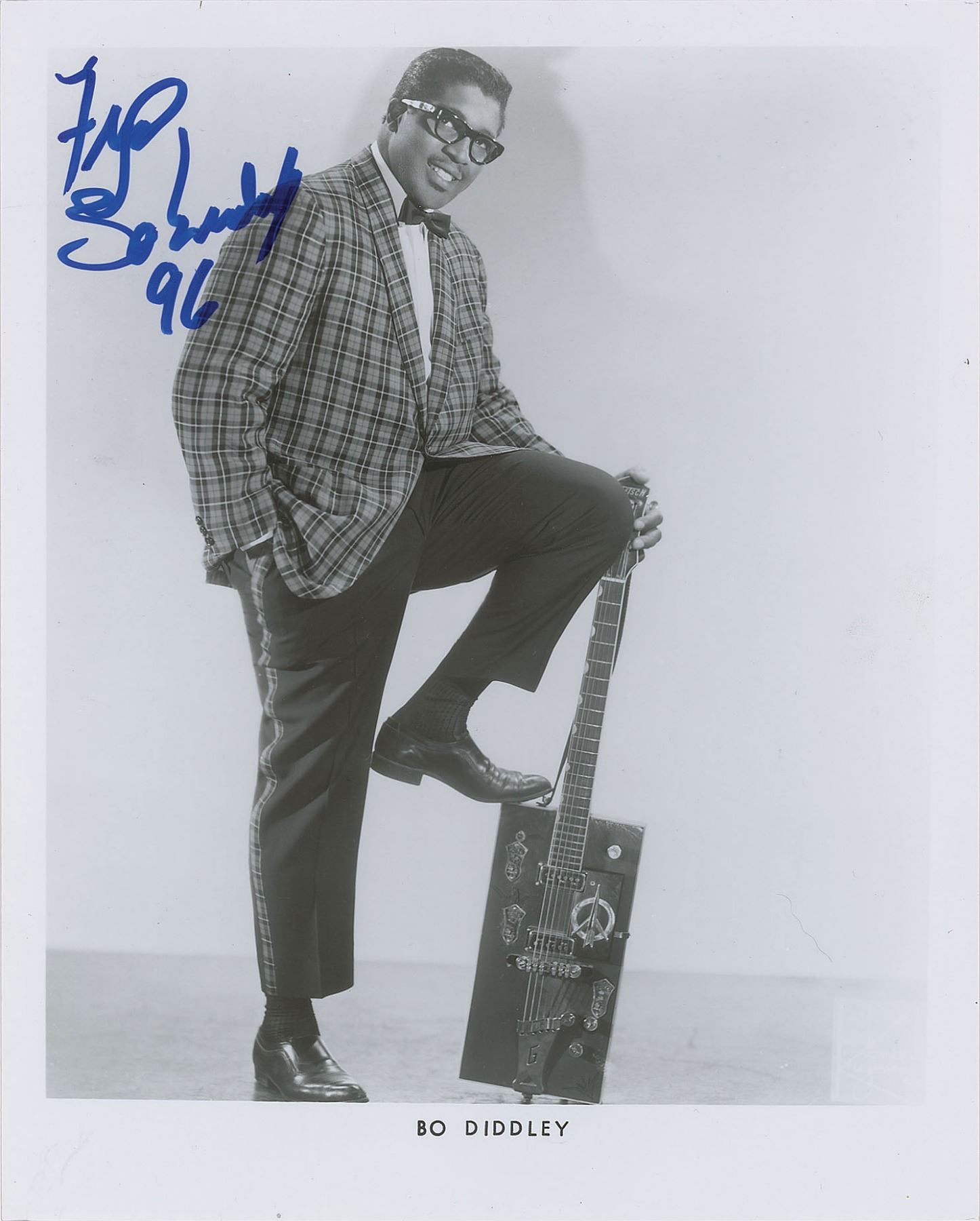Two glossy 8 x 10 photos of Bo Diddley, one as a young musician and the other as a legitimate blues rock legend, both of which show him posing with his trademark 'cigar box' guitar, both signed in blue felt tip. In overall fine condition.