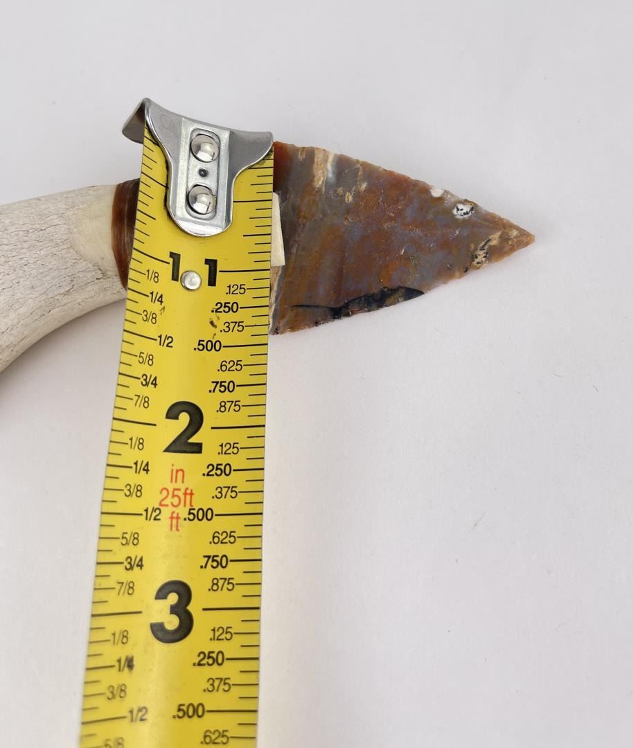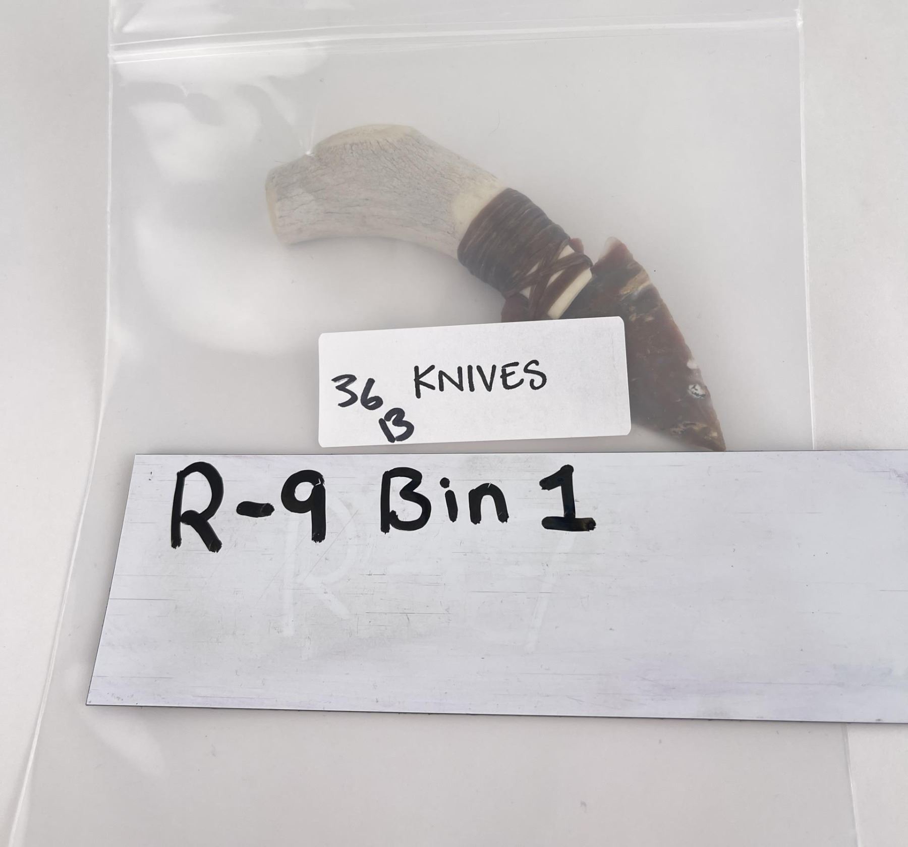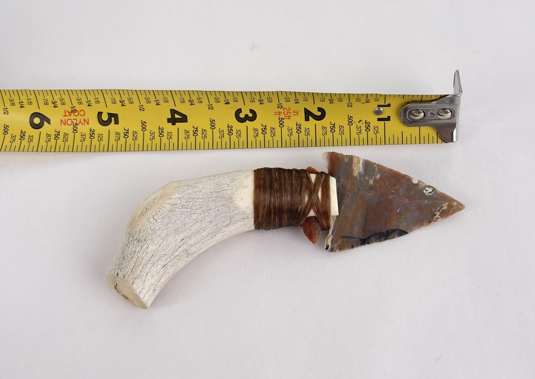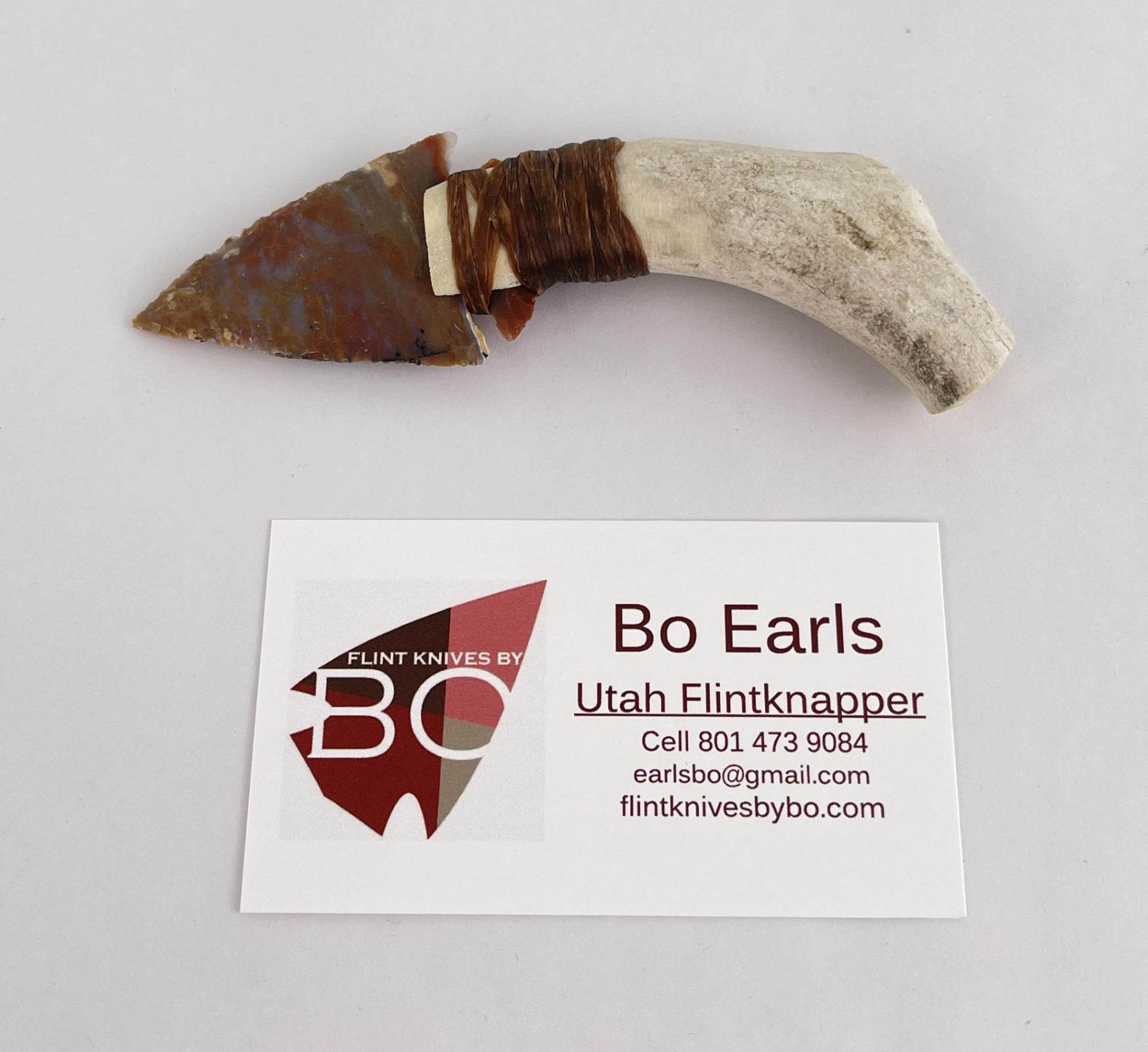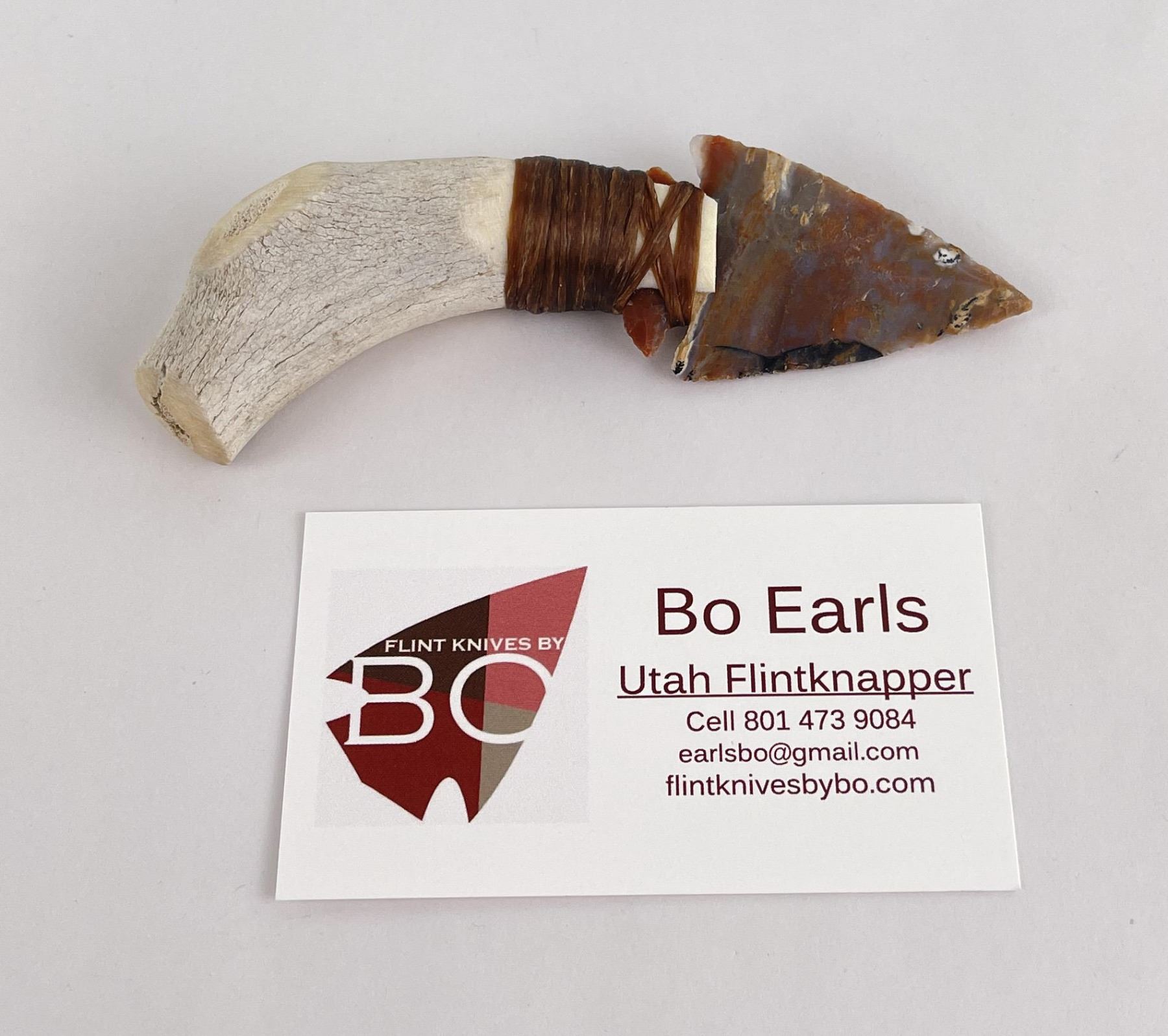 Handmade by Bo Earls. Bo is one of the finest modern flint and obsidian knappers. His knives are some of the nicest money can buy. The handle is whitetail deer horn. 5" long including handle.