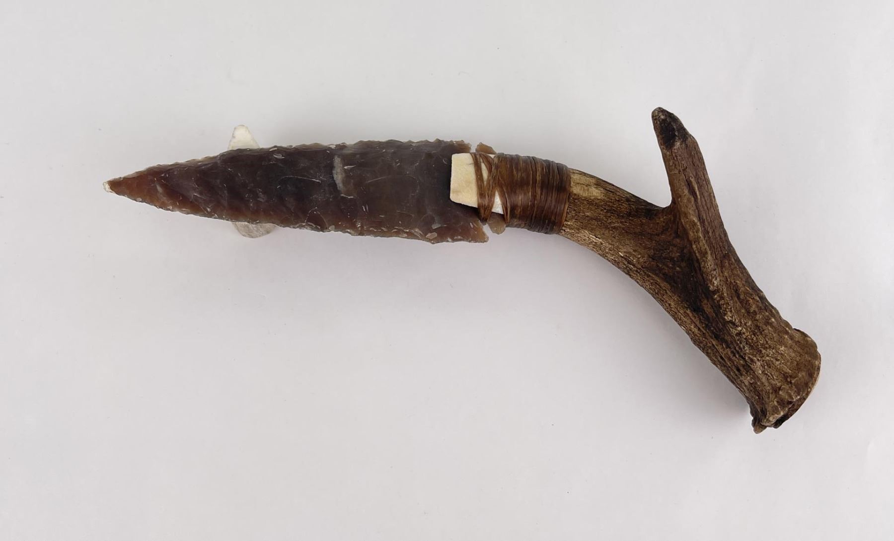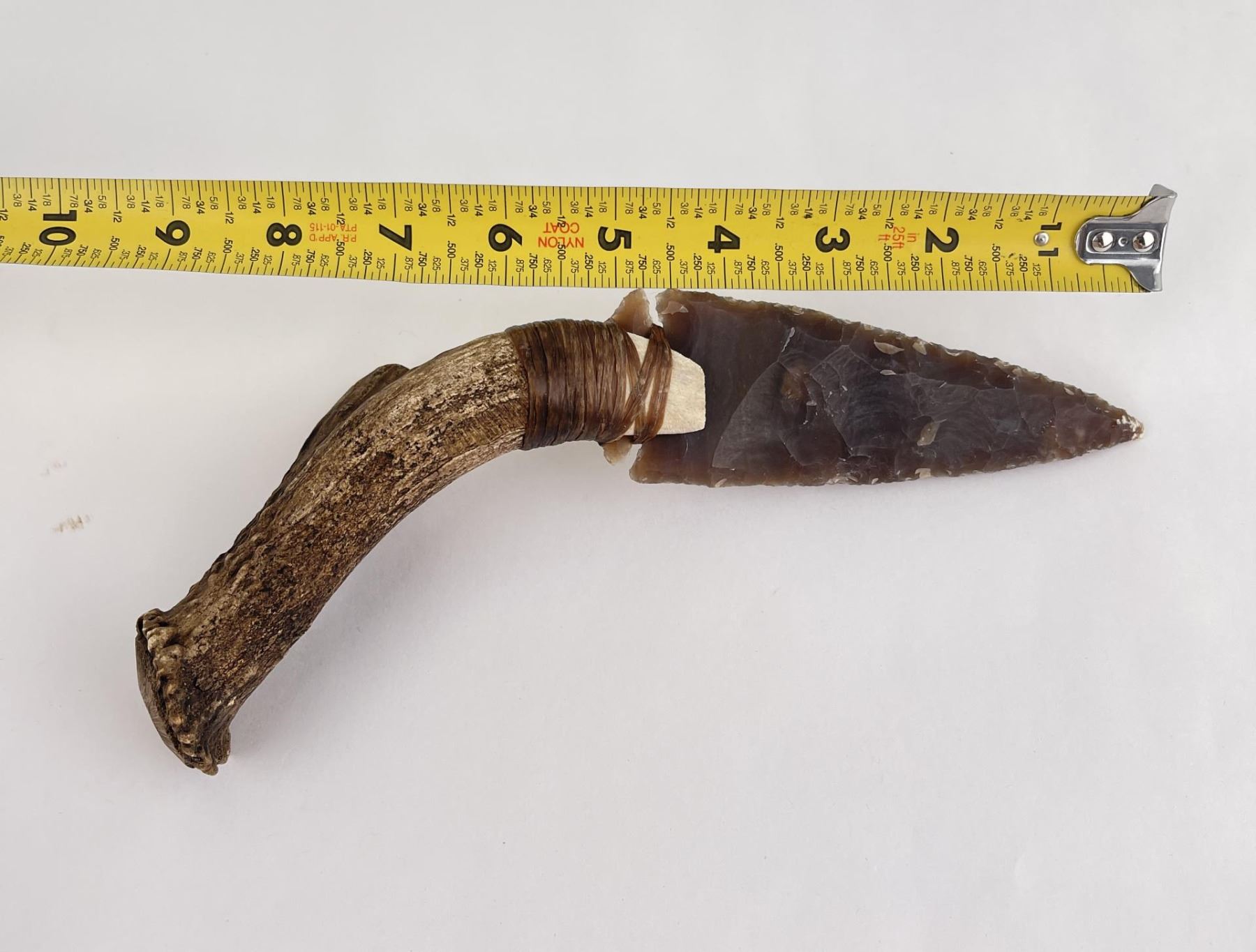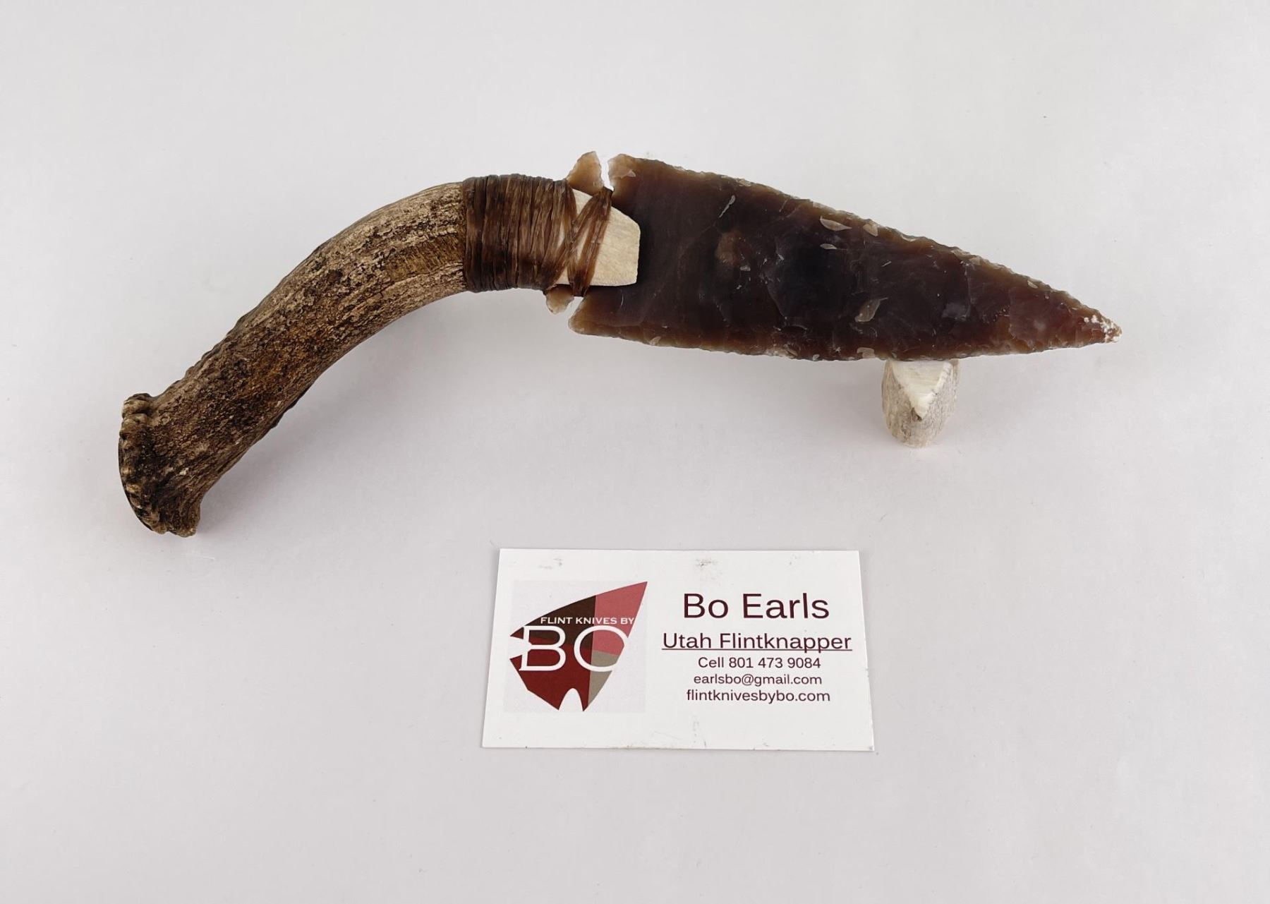 Handmade by Bo Earls. Bo is one of the finest modern flint and obsidian knappers. His knives are some of the nicest money can buy. The handle is whitetail deer horn. 9" long including handle.