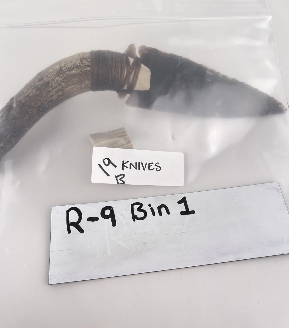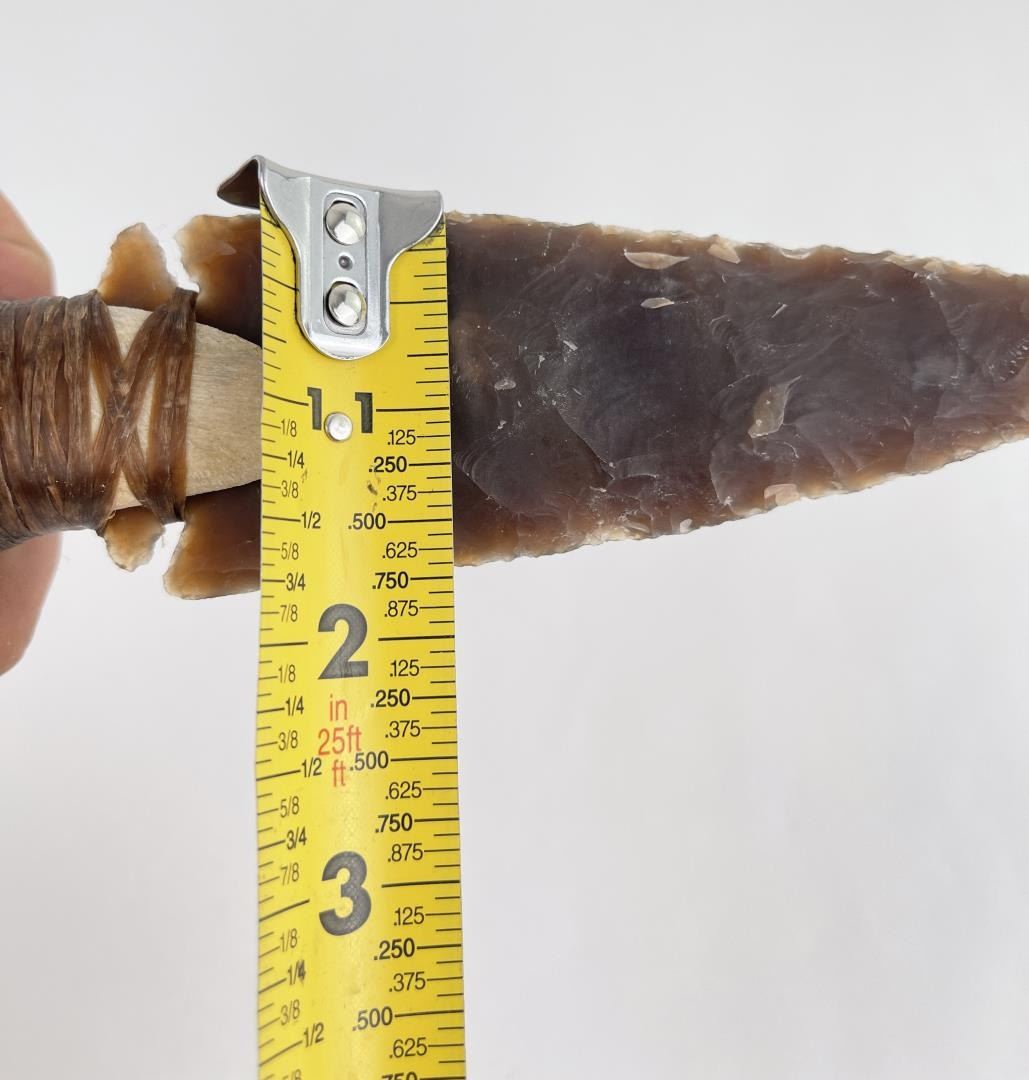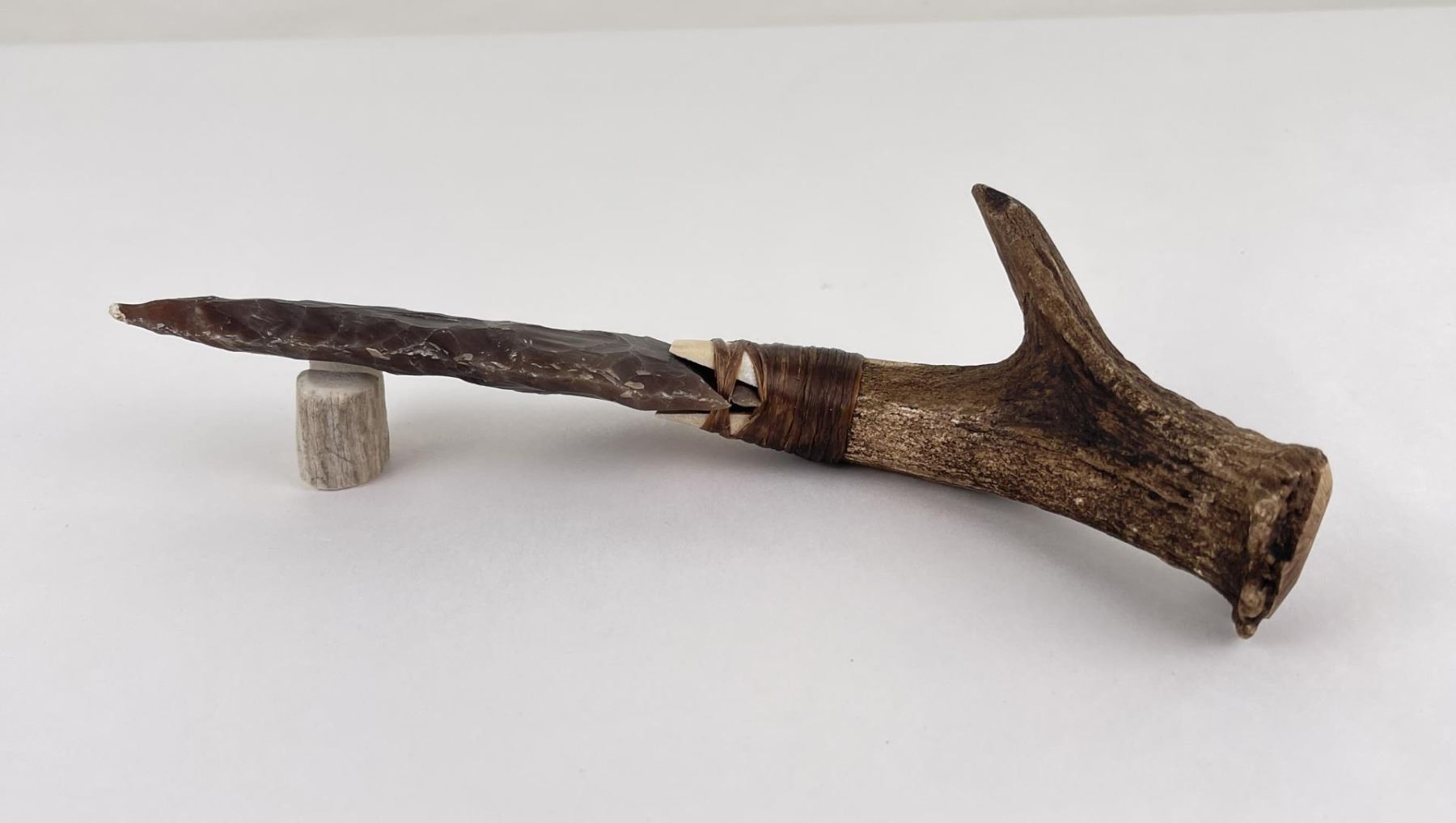 Handmade by Bo Earls. Bo is one of the finest modern flint and obsidian knappers. His knives are some of the nicest money can buy. The handle is whitetail deer horn. 9" long including handle.