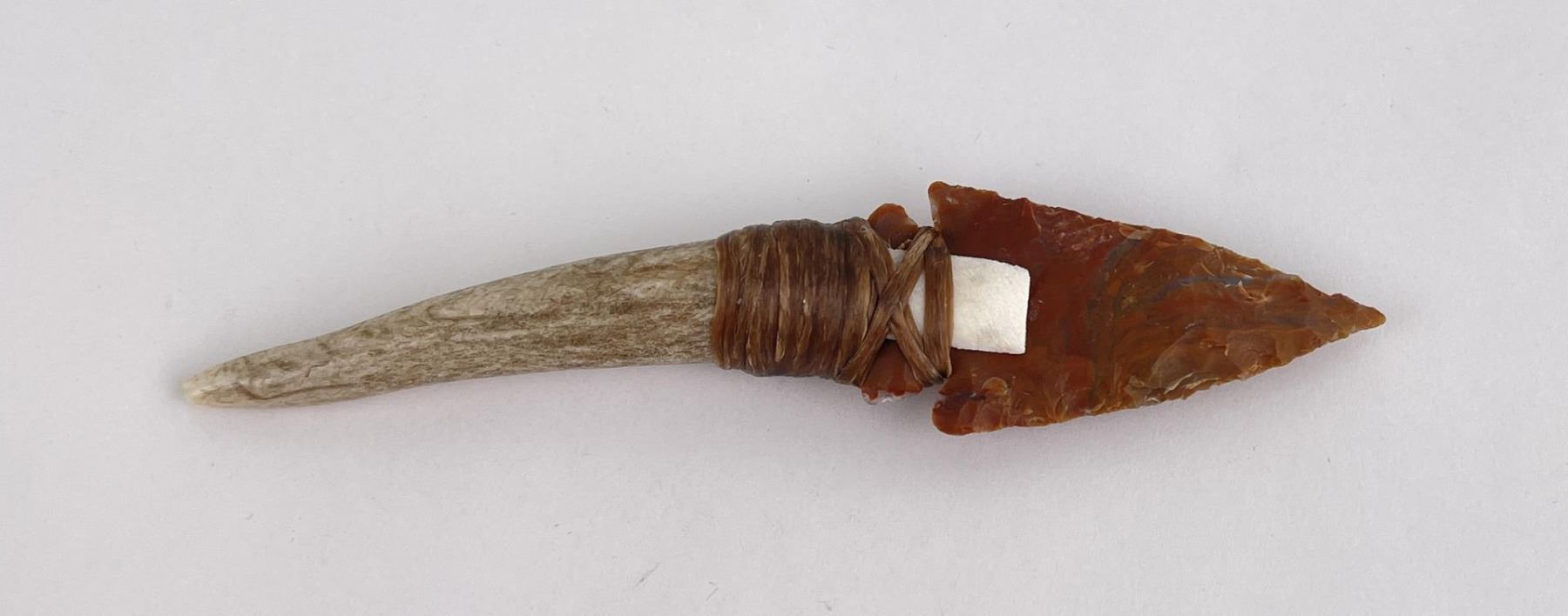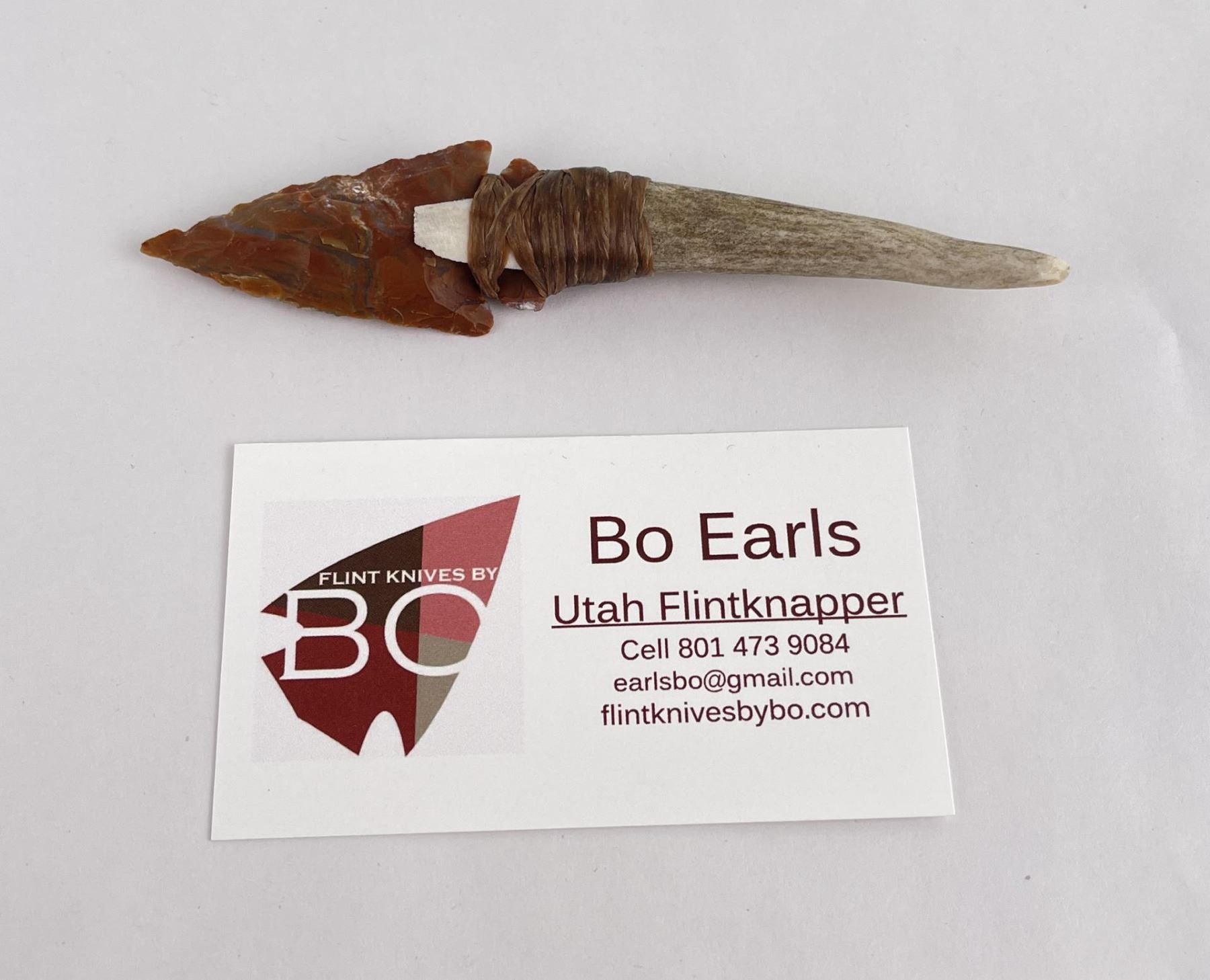 Handmade by Bo Earls. Bo is one of the finest modern flint and obsidian knappers. His knives are some of the nicest money can buy. The handle is whitetail deer horn. 5" long including handle.