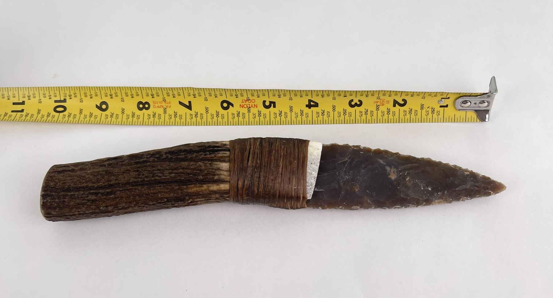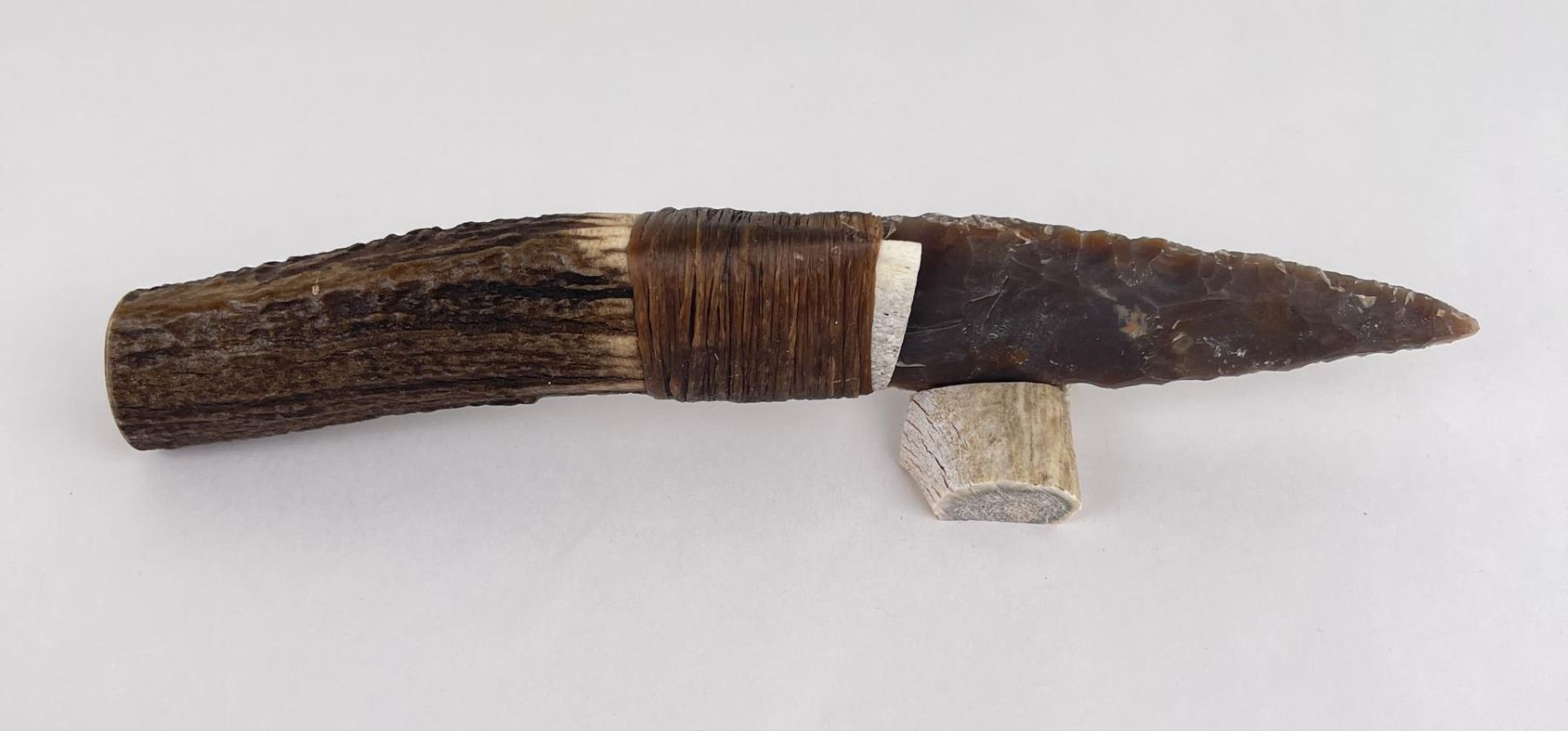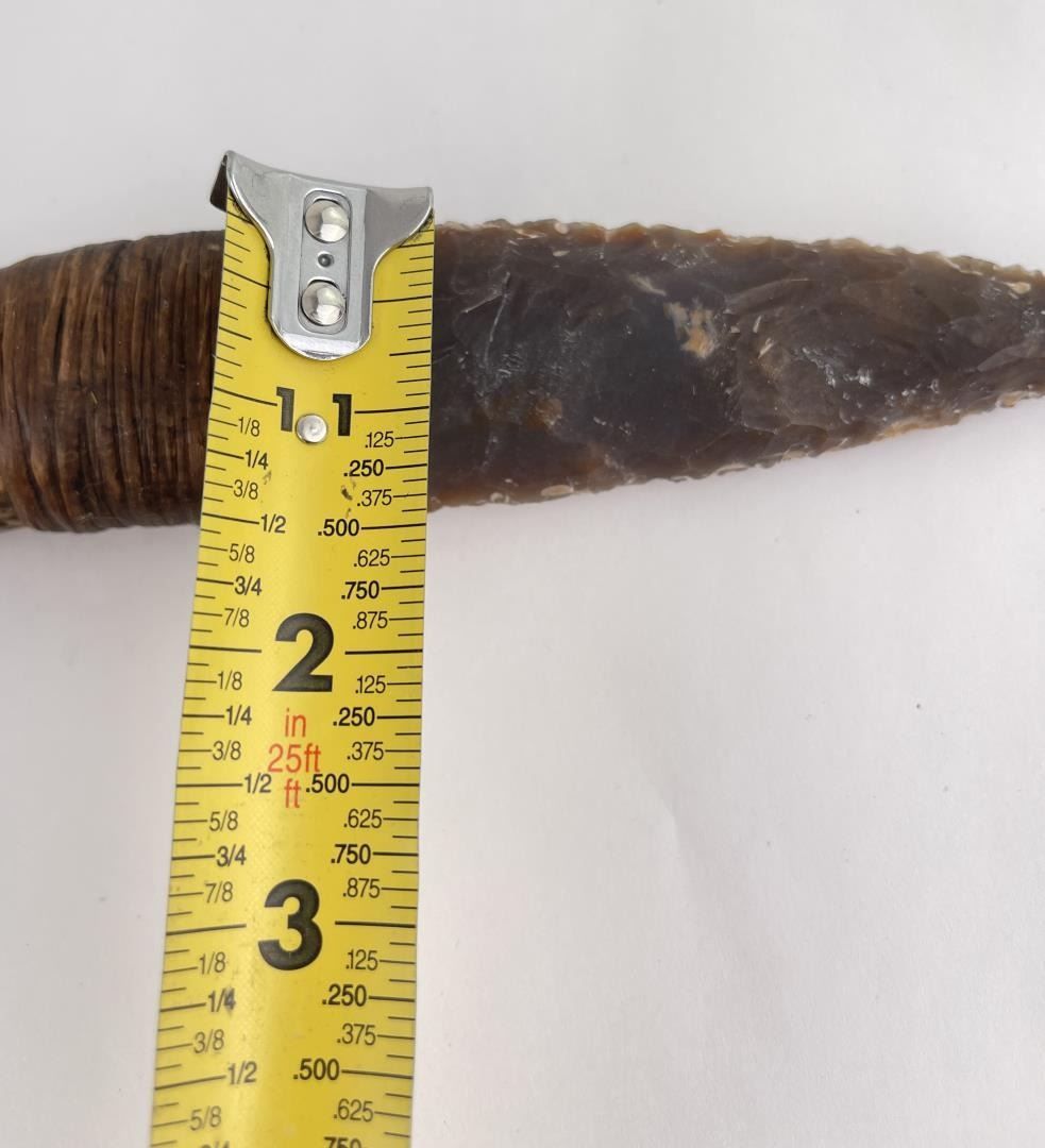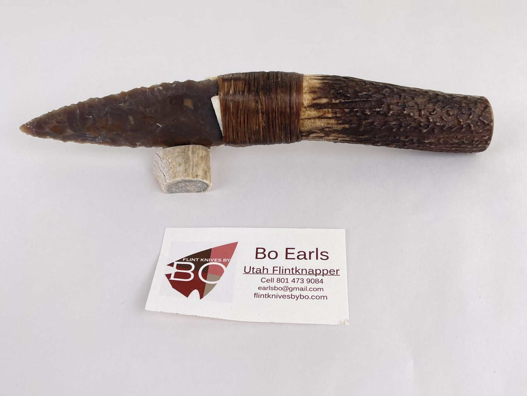 Handmade by Bo Earls. Bo is one of the finest modern flint and obsidian knappers. His knives are some of the nicest money can buy. The handle is whitetail deer horn. 10" long including handle.