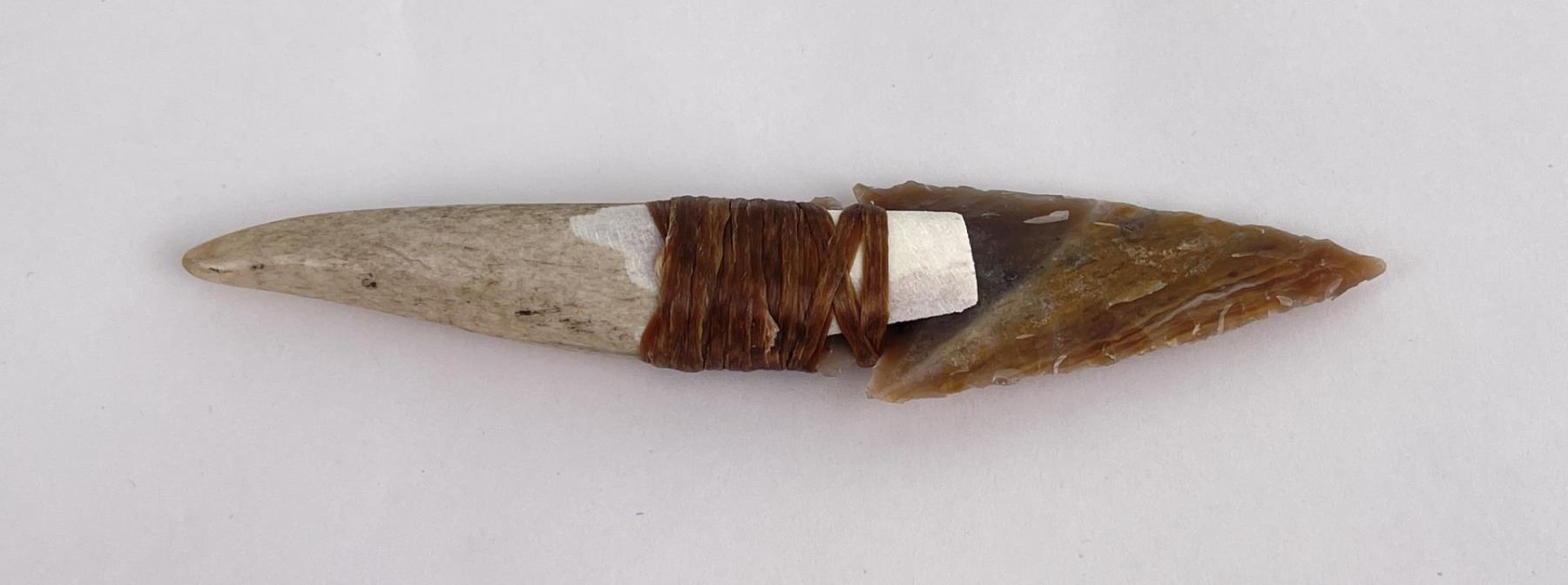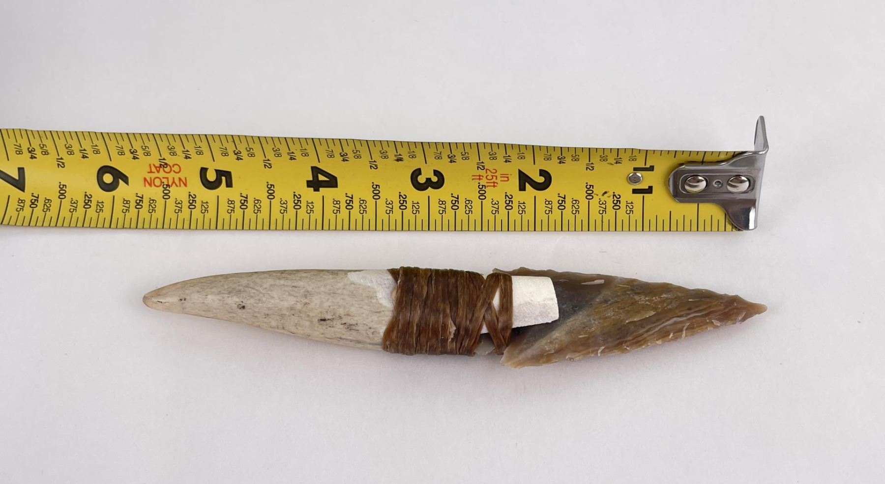 Handmade by Bo Earls. Bo is one of the finest modern flint and obsidian knappers. His knives are some of the nicest money can buy. The handle is whitetail deer horn. 5 1/2" long including handle.