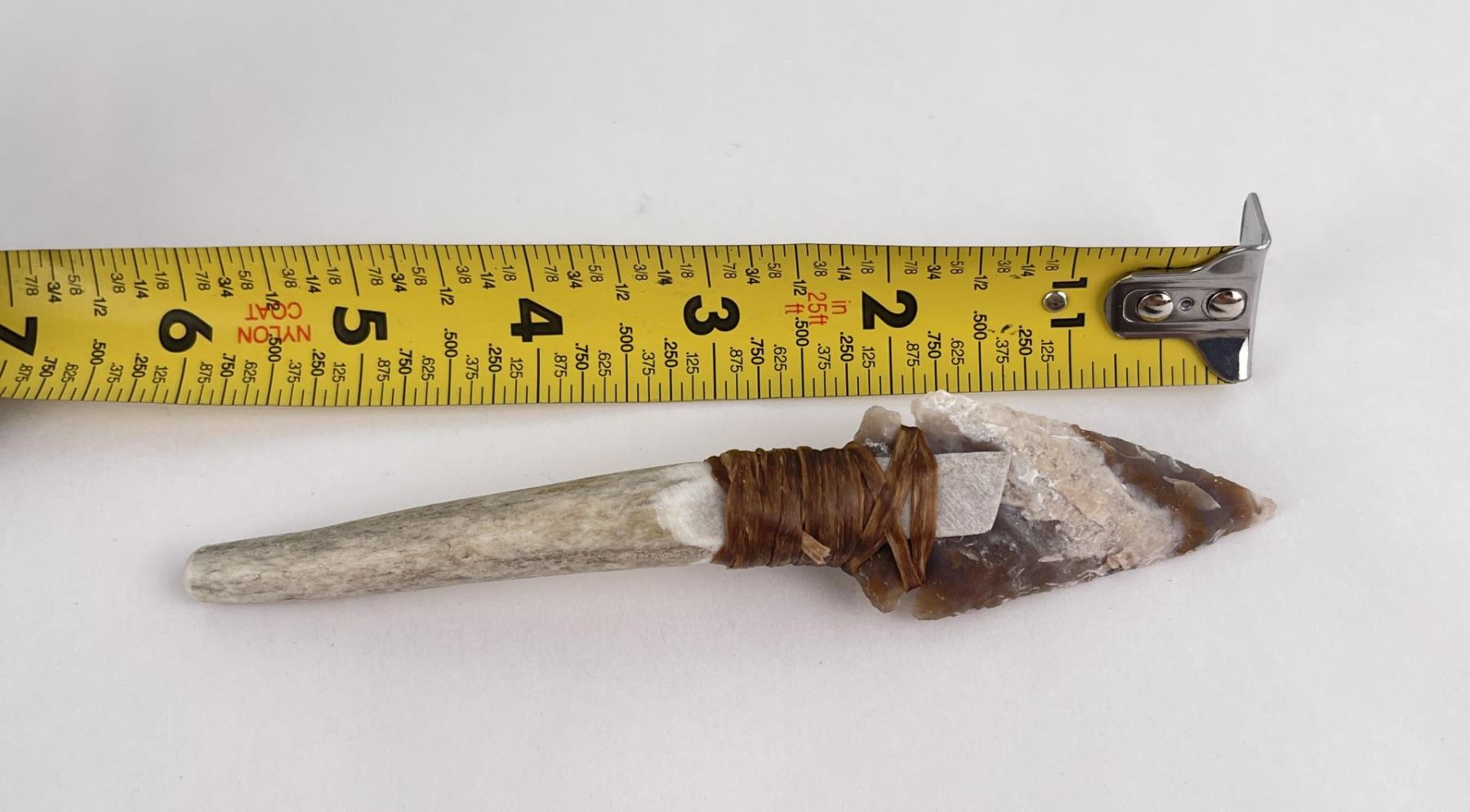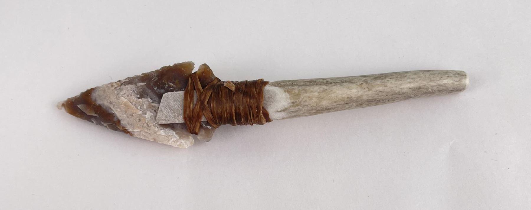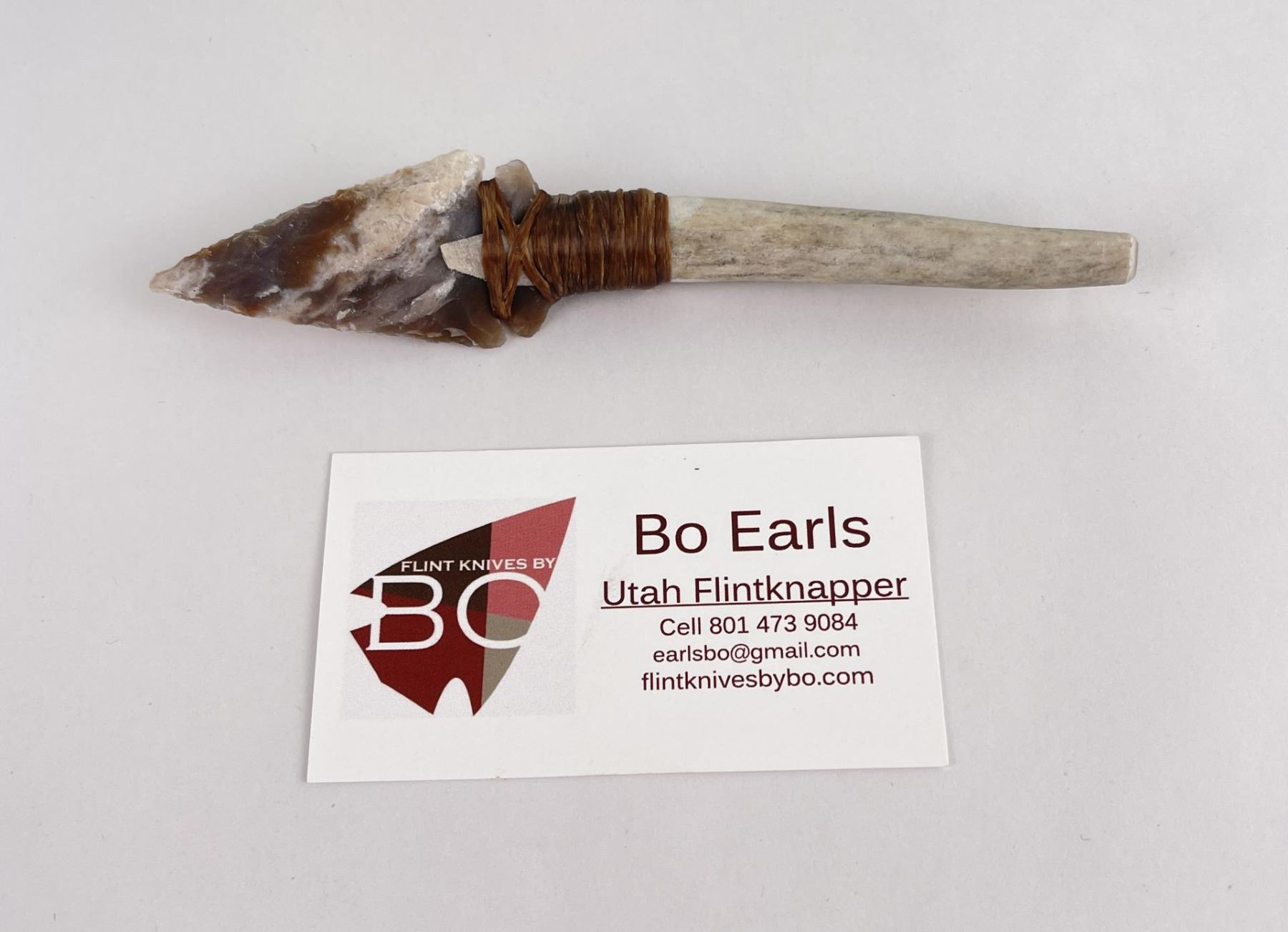 Handmade by Bo Earls. Bo is one of the finest modern flint and obsidian knappers. His knives are some of the nicest money can buy. The handle is whitetail deer horn. 6" long including handle.