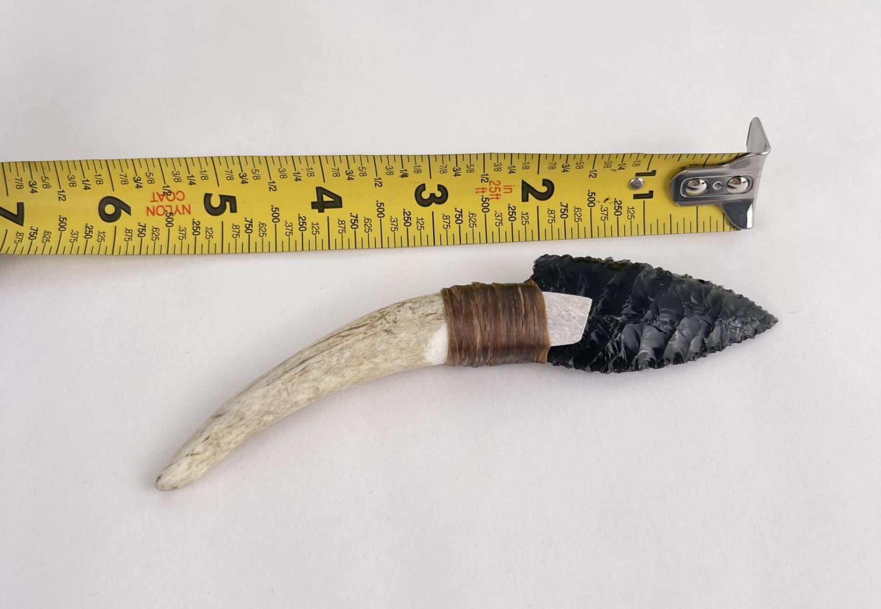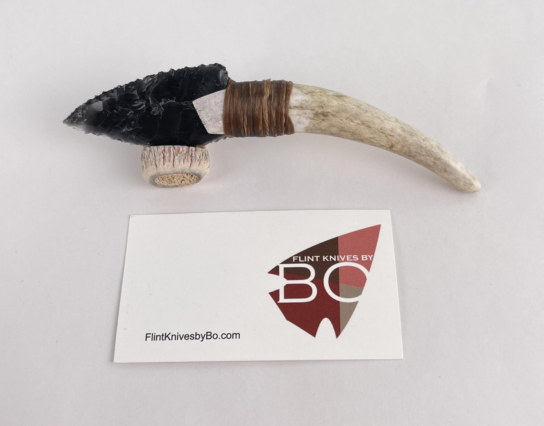 Handmade by Bo Earls. Bo is one of the finest modern flint and obsidian knappers. His knives are some of the nicest money can buy. The handle is whitetail deer horn. 6" long including handle.