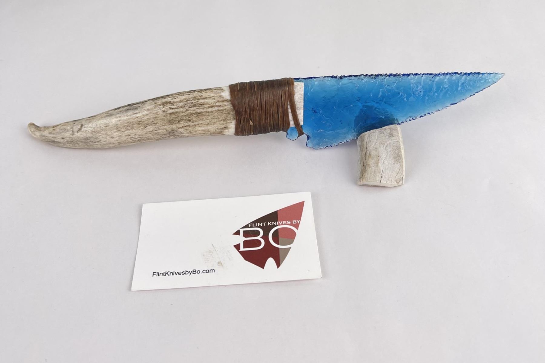 Handmade by Bo Earls. Bo is one of the finest modern flint and obsidian knappers. His knives are some of the nicest money can buy. The handle is whitetail deer horn. 11" long including handle.