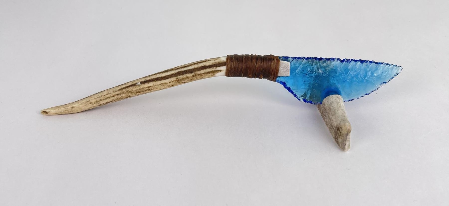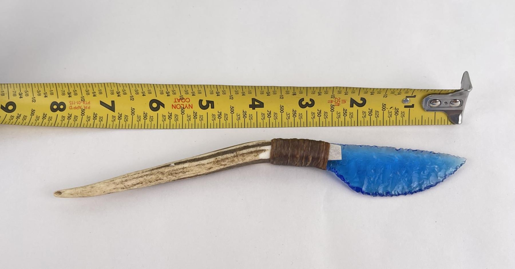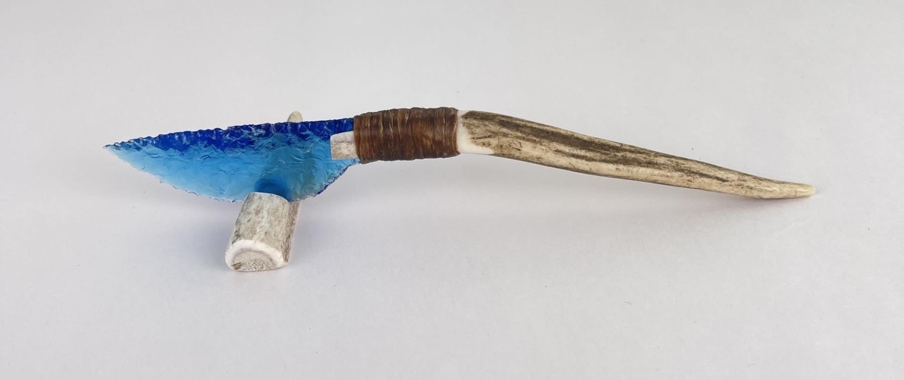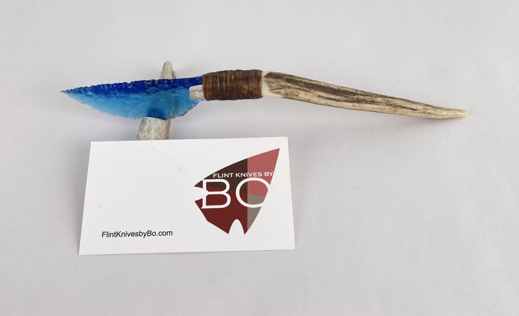 Handmade by Bo Earls. Bo is one of the finest modern flint and obsidian knappers. His knives are some of the nicest money can buy. The handle is whitetail deer horn. 8" long including handle.