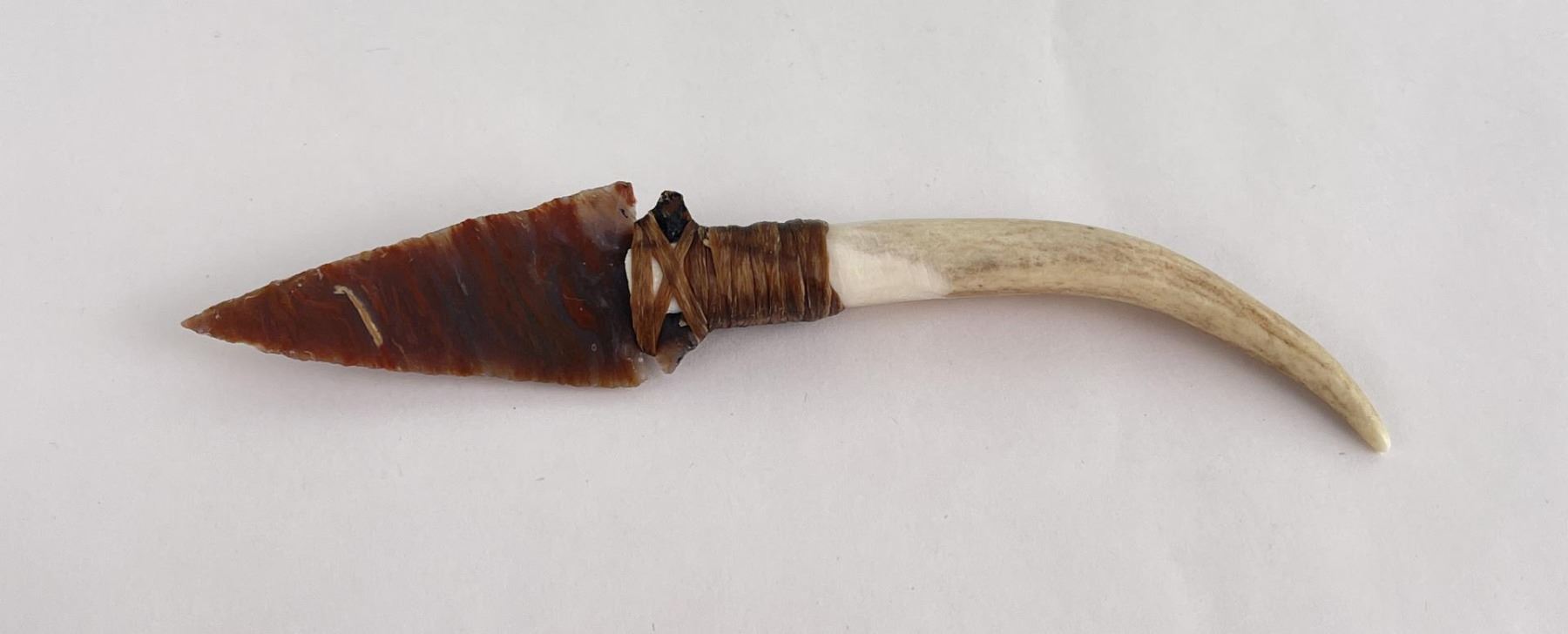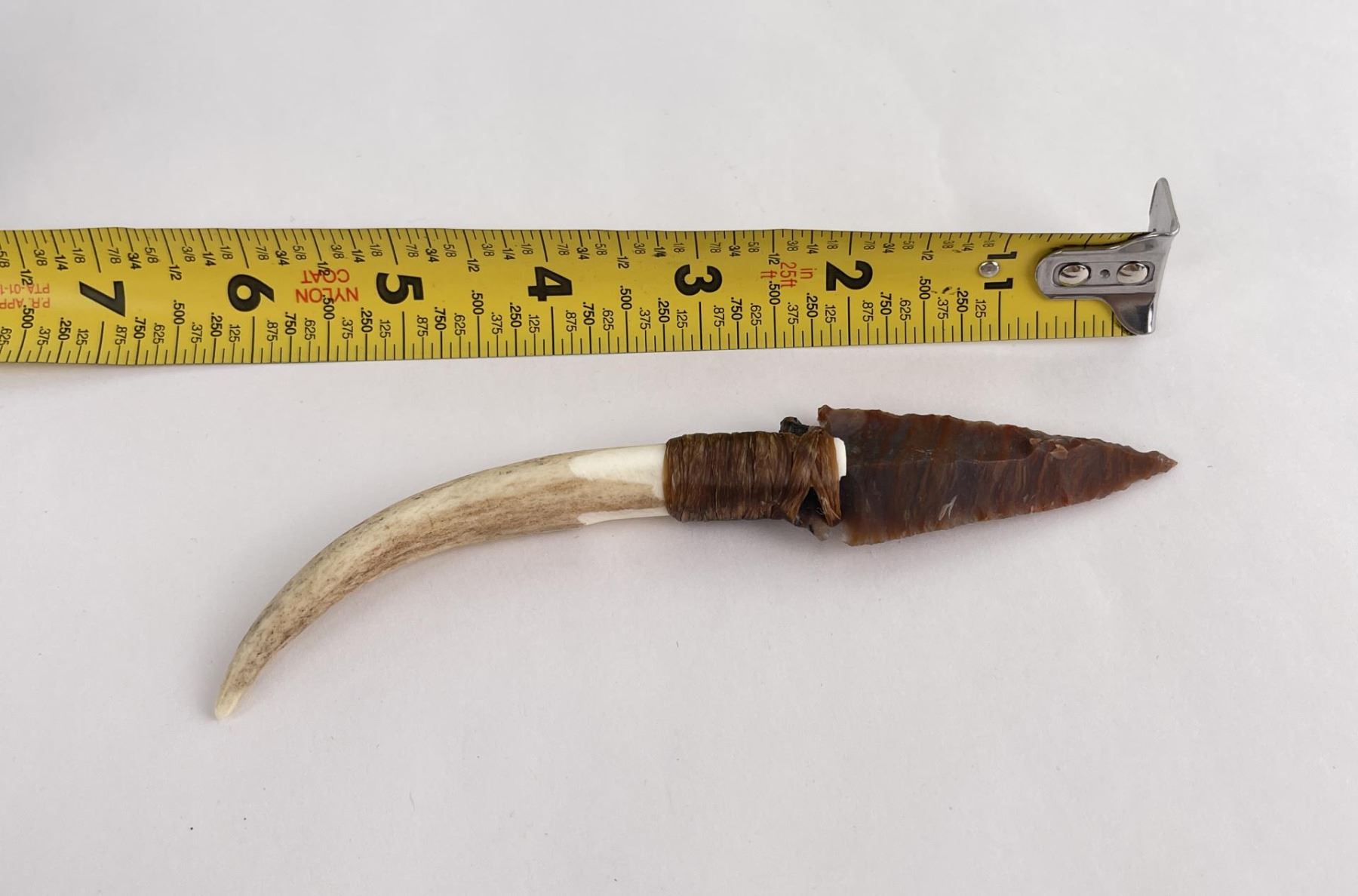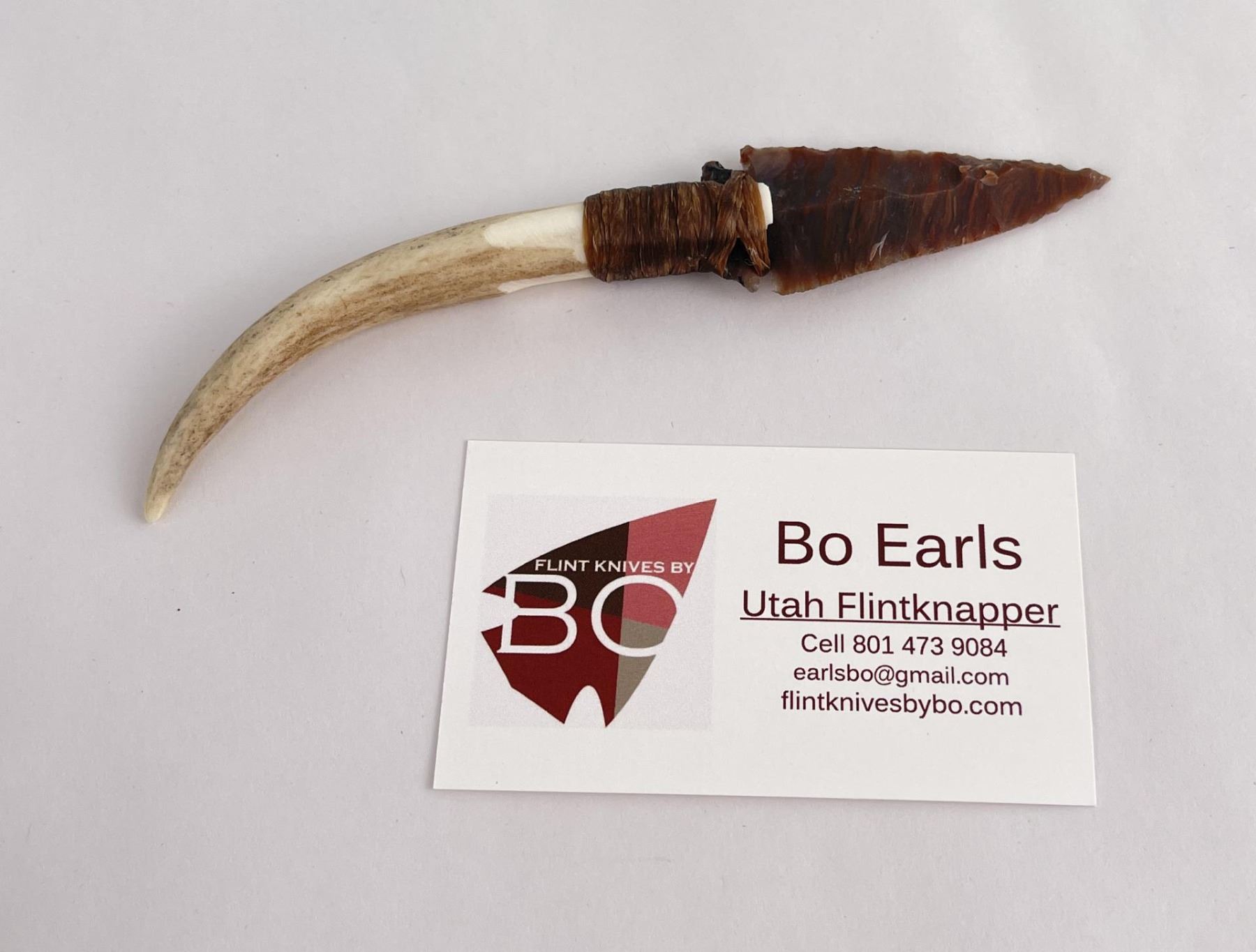 Handmade by Bo Earls. Bo is one of the finest modern flint and obsidian knappers. His knives are some of the nicest money can buy. The handle is whitetail deer horn. 6 1/2" long including handle.