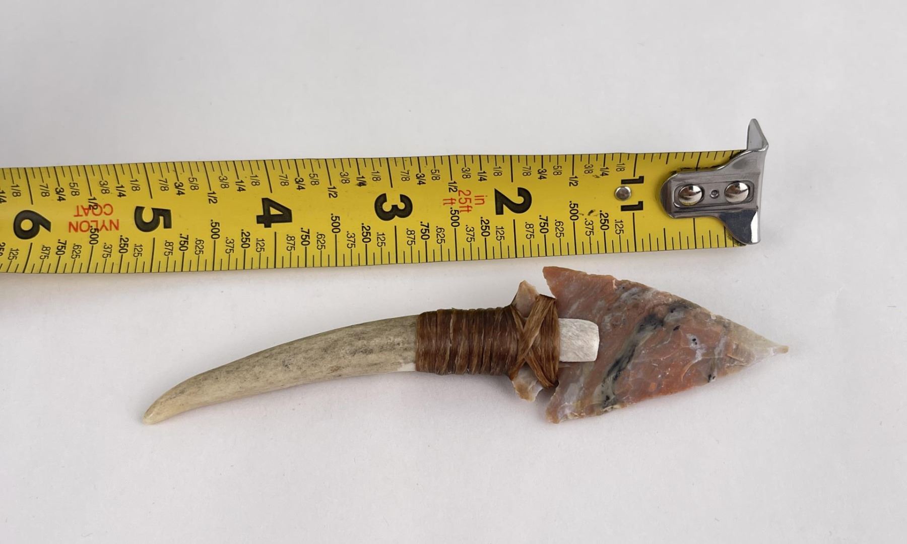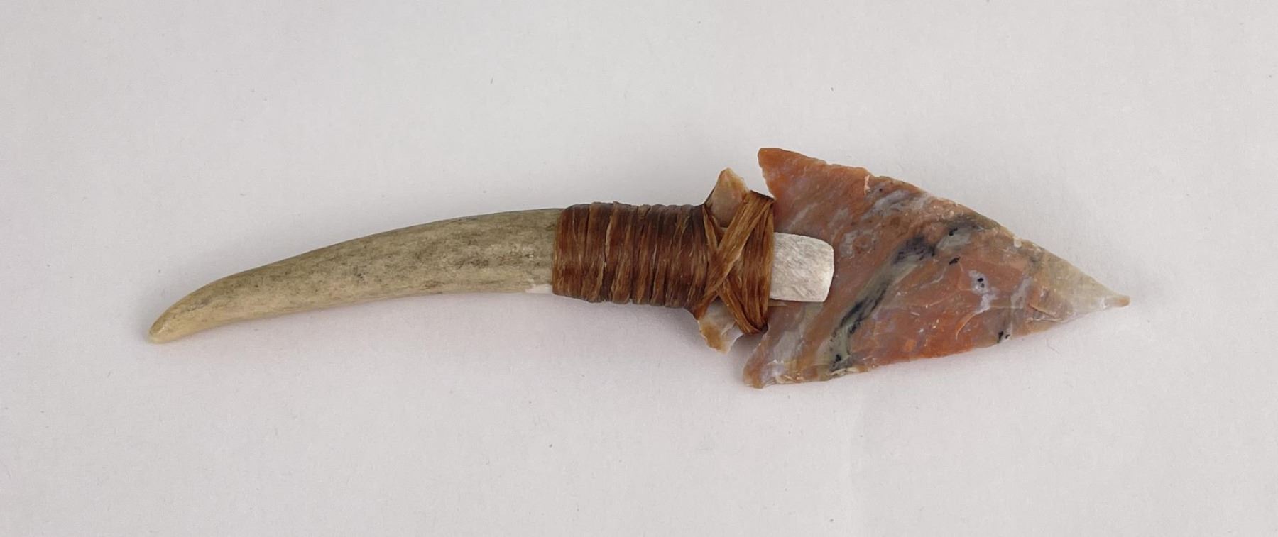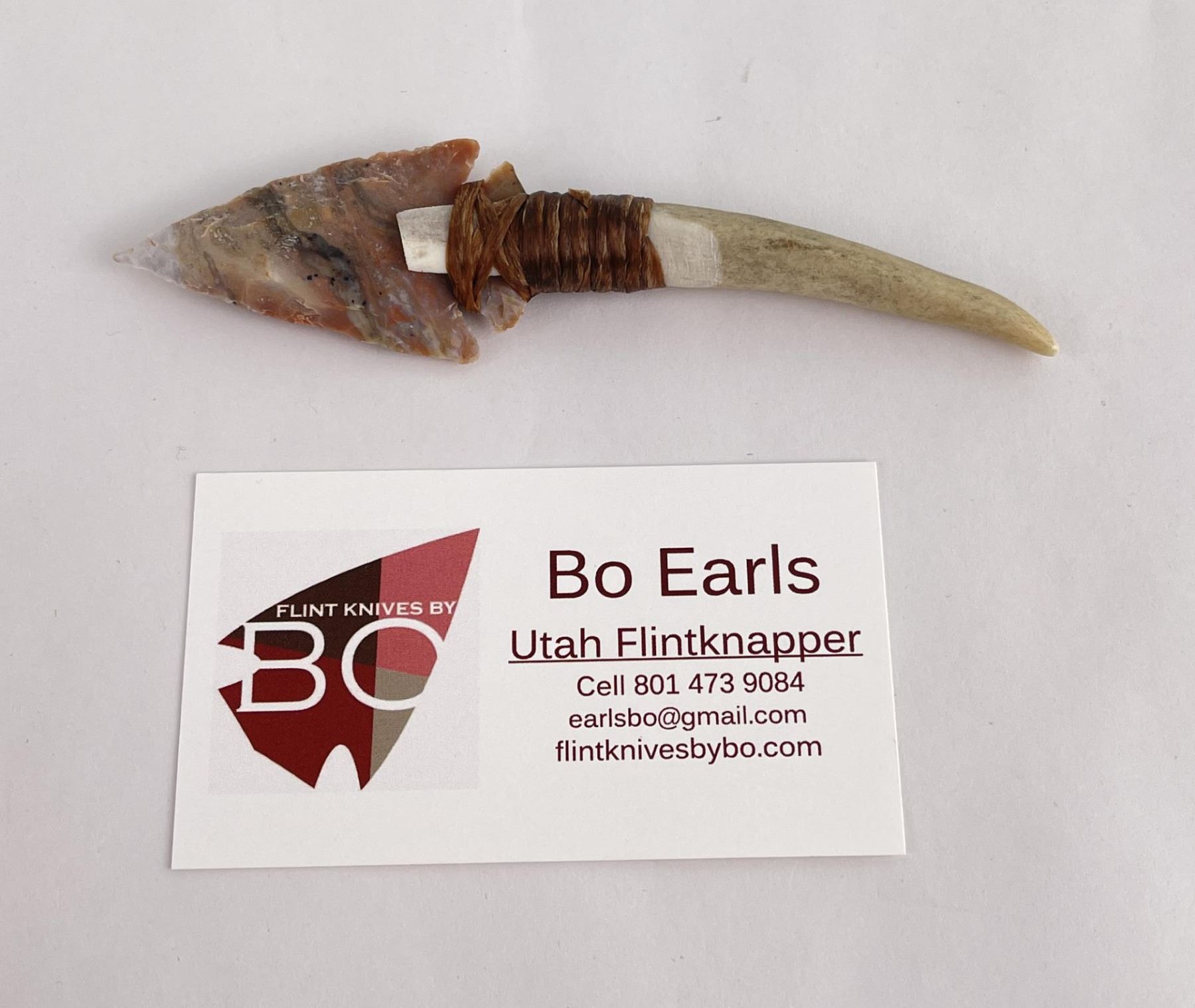 Handmade by Bo Earls. Bo is one of the finest modern flint and obsidian knappers. His knives are some of the nicest money can buy. The handle is whitetail deer horn. 5" long including handle.