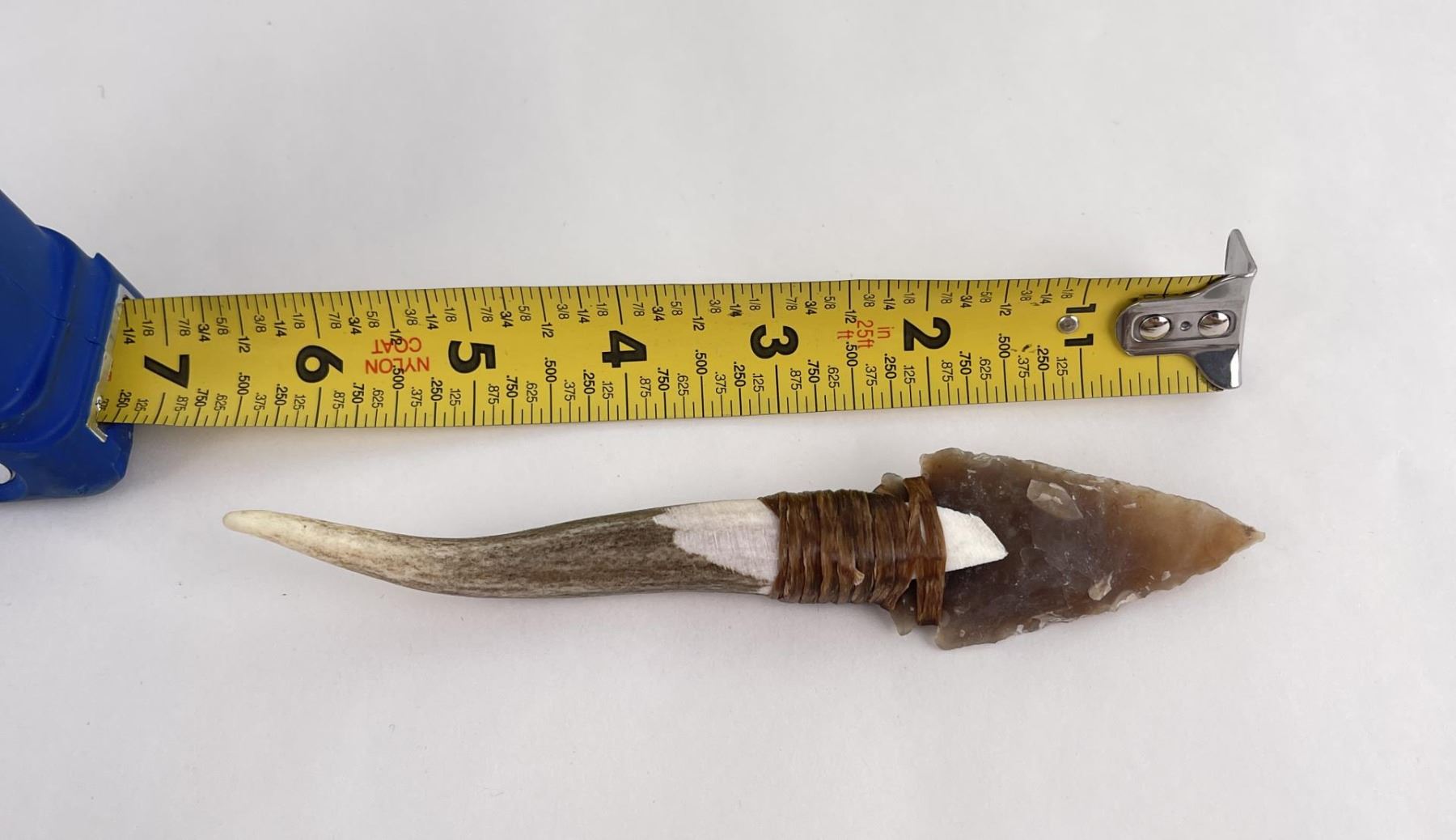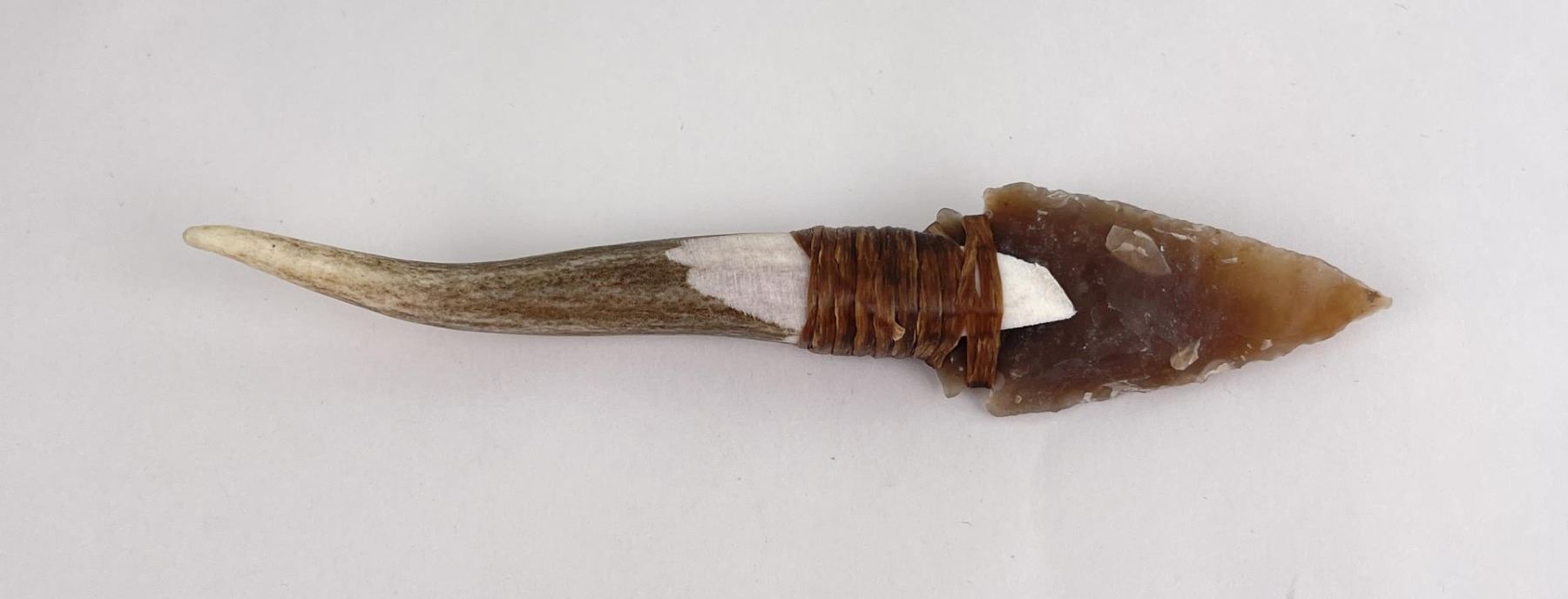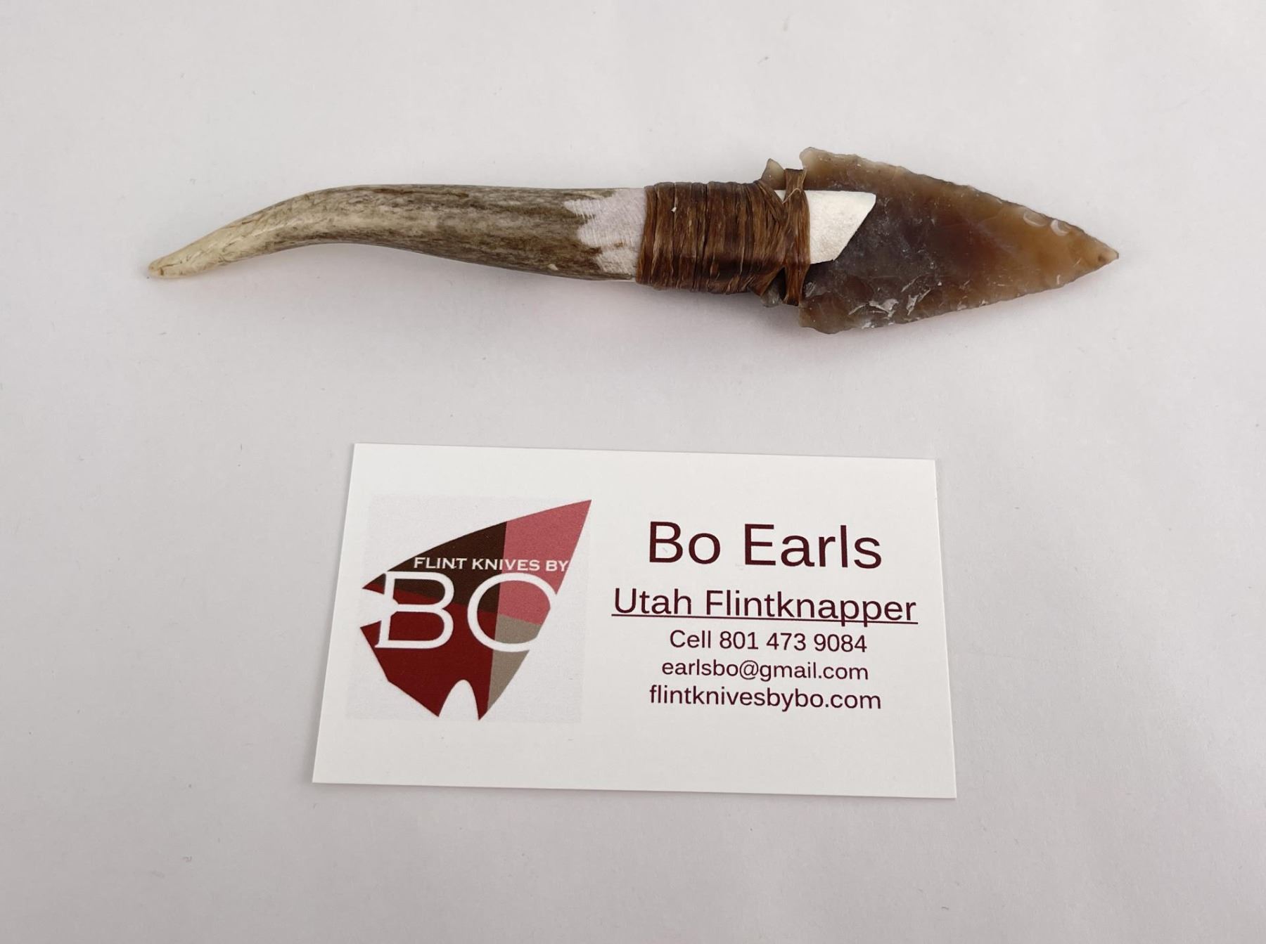 Handmade by Bo Earls. Bo is one of the finest modern flint and obsidian knappers. His knives are some of the nicest money can buy. The handle is whitetail deer horn. 6 1/2" long including handle.