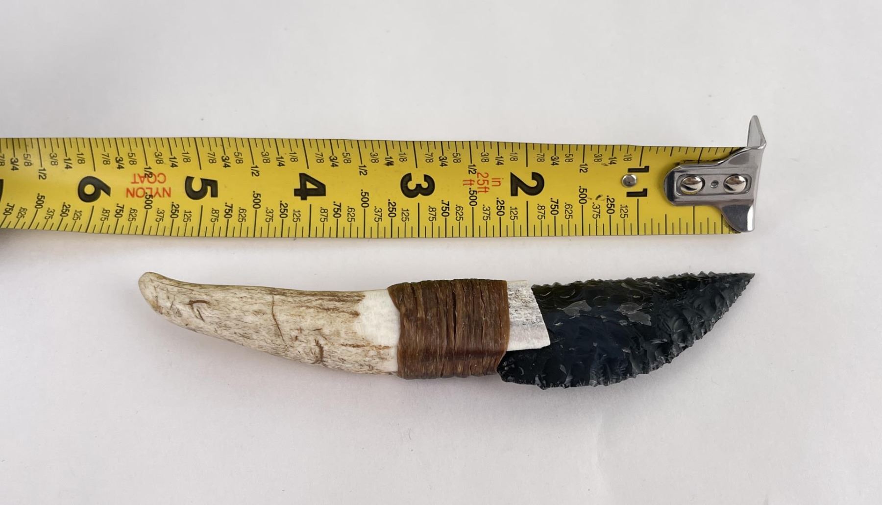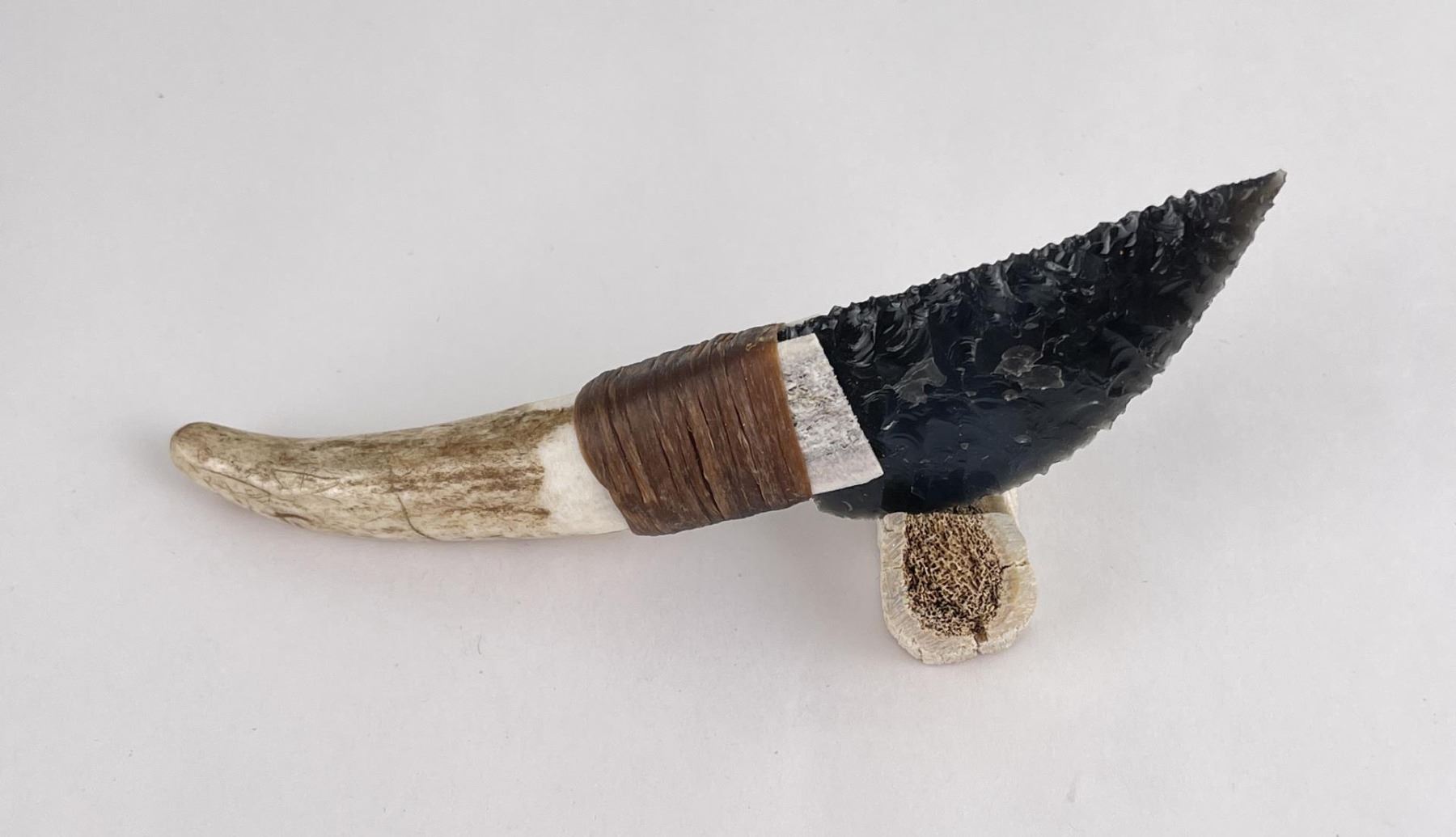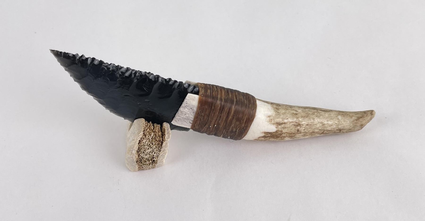 Handmade by Bo Earls. Bo is one of the finest modern flint and obsidian knappers. His knives are some of the nicest money can buy. The handle is whitetail deer horn. 5 1/2" long including handle.