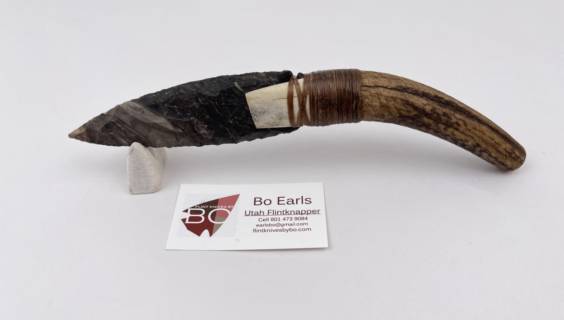 Handmade by Bo Earls. Bo is one of the finest modern flint and obsidian knappers. His knives are some of the nicest money can buy. The handle is whitetail deer horn. 11 1/2" long including handle.