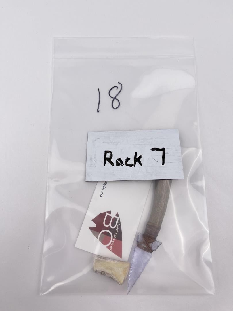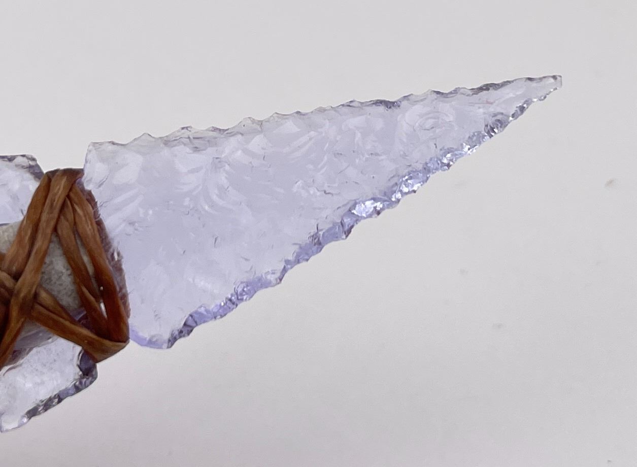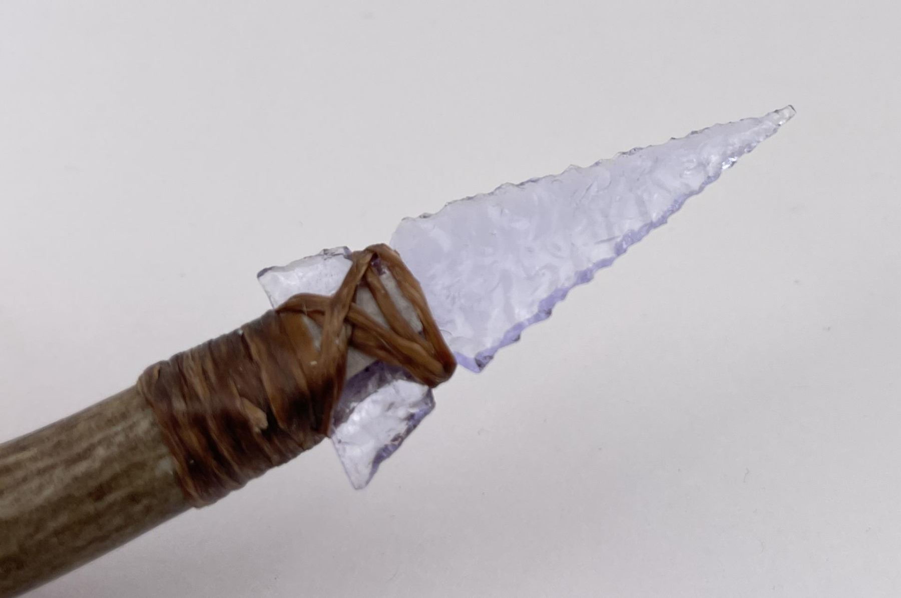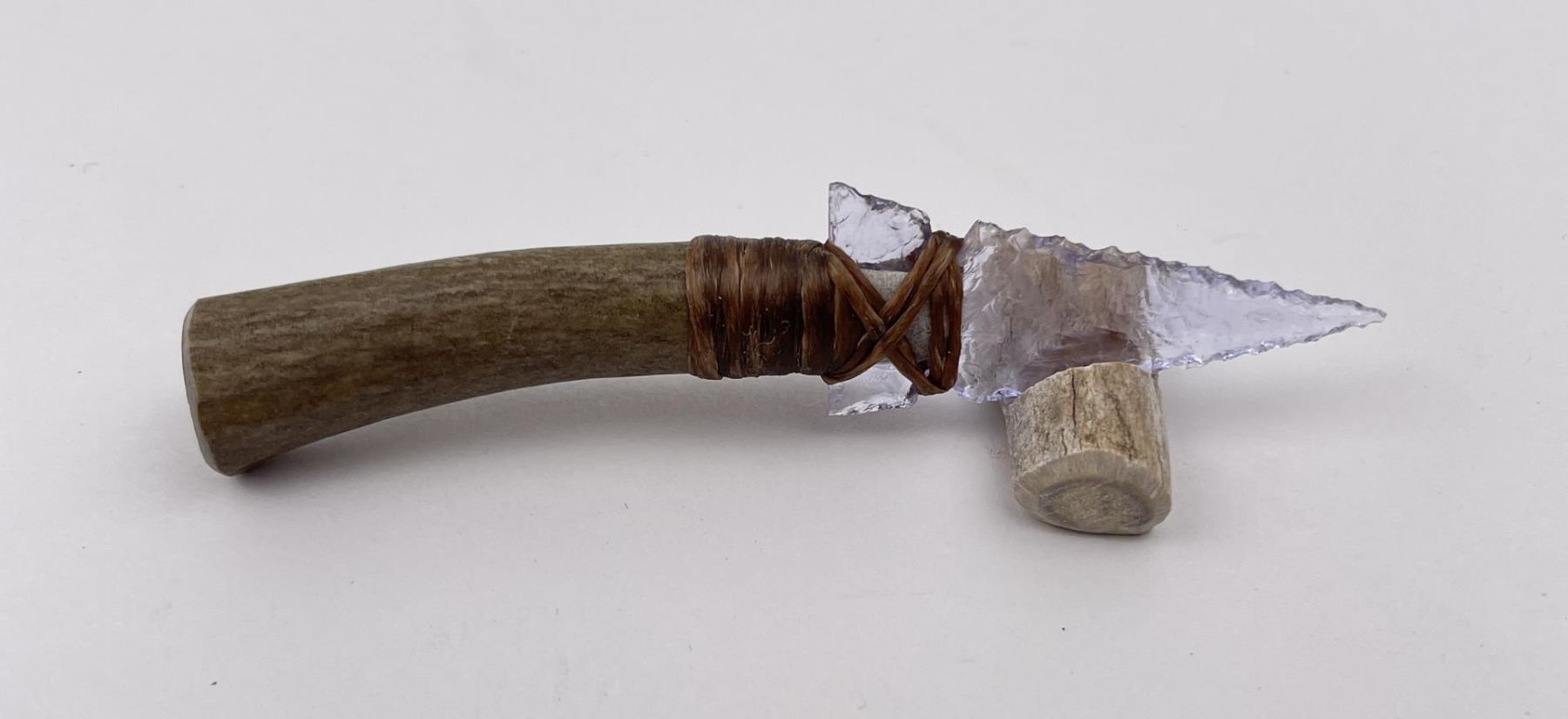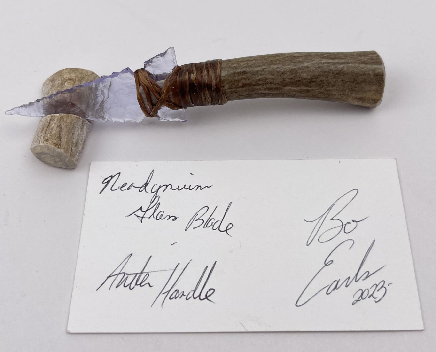 Handmade by Bo Earls. Bo is one of the finest modern flint and obsidian knappers. His knives are some of the nicest money can buy. The handle is whitetail deer horn. 4 1/2" long including handle.