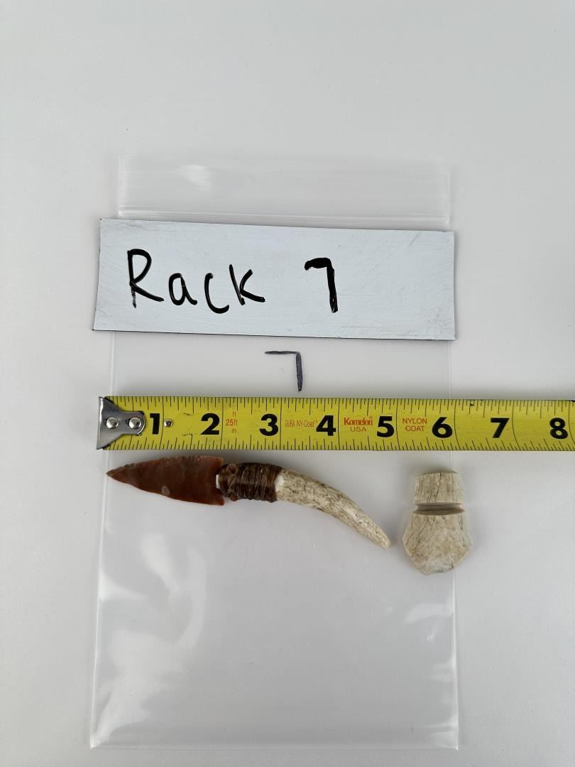 Handmade by Bo Earls. Bo is one of the finest modern flint and obsidian knappers. His knives are some of the nicest money can buy. The handle is whitetail deer horn. 4 3/4" long including handle.