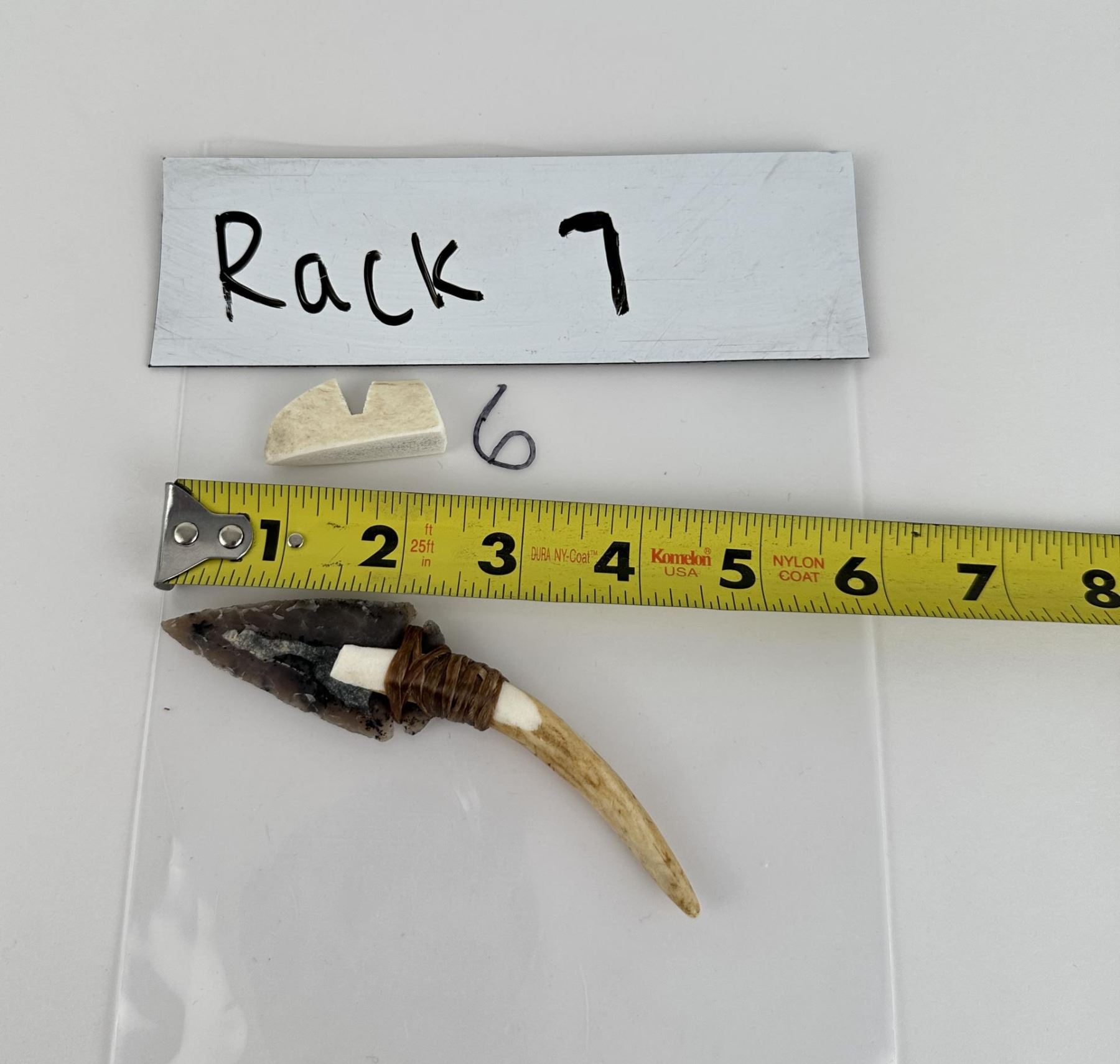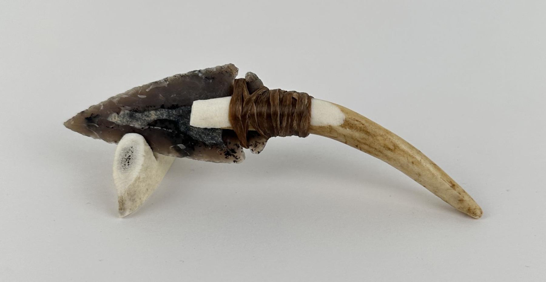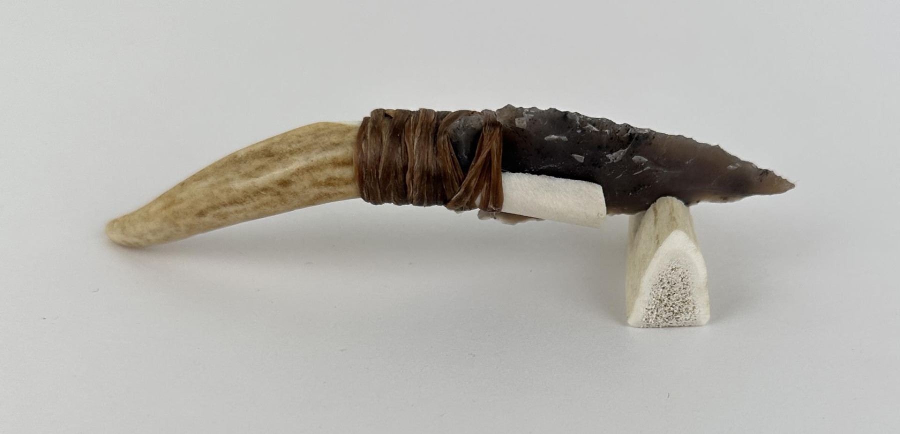 Handmade by Bo Earls. Bo is one of the finest modern flint and obsidian knappers. His knives are some of the nicest money can buy. The handle is whitetail deer horn. 4 1/2" long including handle.