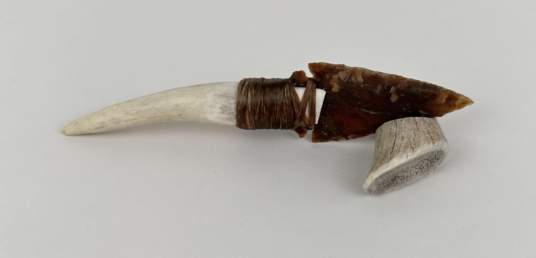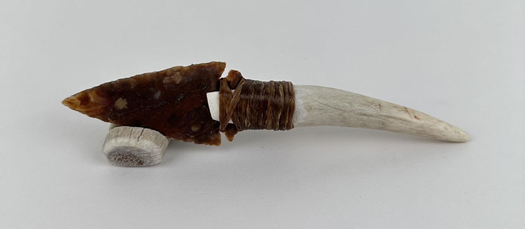 Handmade by Bo Earls. Bo is one of the finest modern flint and obsidian knappers. His knives are some of the nicest money can buy. The handle is whitetail deer horn. 6" long including handle.
