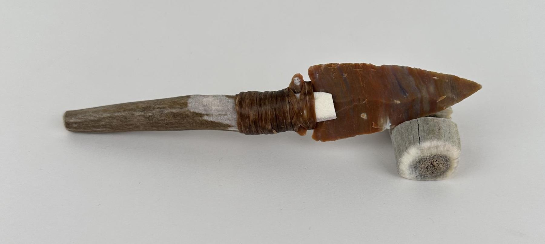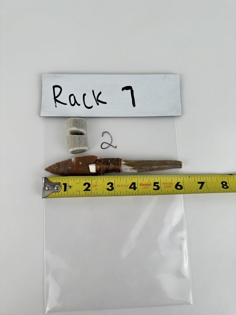 Handmade by Bo Earls. Bo is one of the finest modern flint and obsidian knappers. His knives are some of the nicest money can buy. The handle is whitetail deer horn. 6" long including handle.